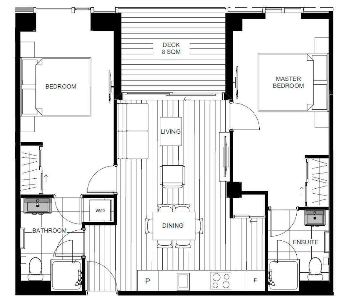 Enjoy sunset views from the 9th-floor north-westerly deck, and all-day sun streaming into the open-plan living and dining space. The modern kitchen features oak cabinetry, engineered stone benchtops, and ample storage.