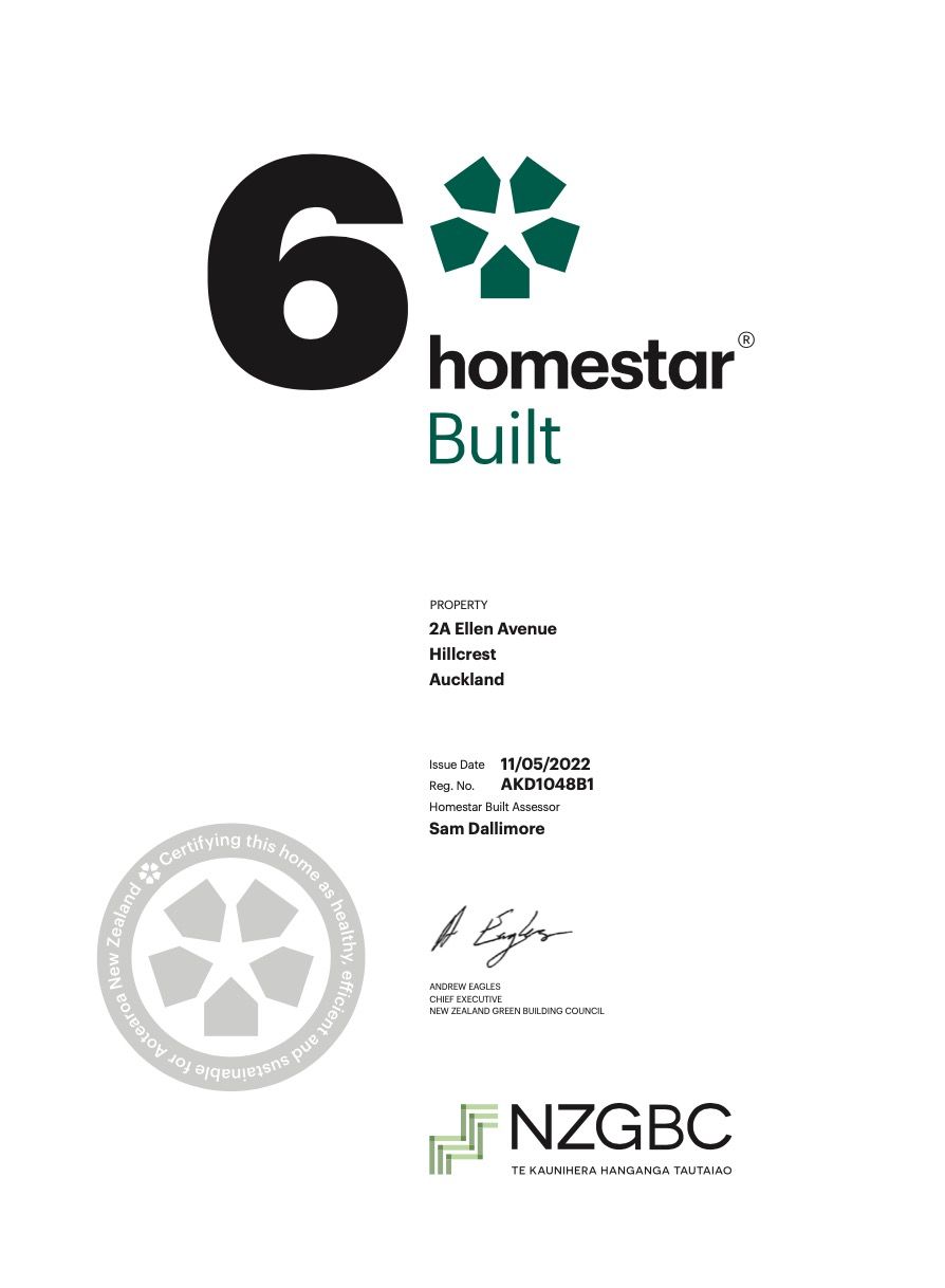 A 6 Homestar rating means the home performs better than one built to the standard Building Code. It’s designed to be warmer, drier, and more energy-efficient, with improved insulation, ventilation, and water-saving features. The rating also reflects healthier indoor air quality, lower power and wat