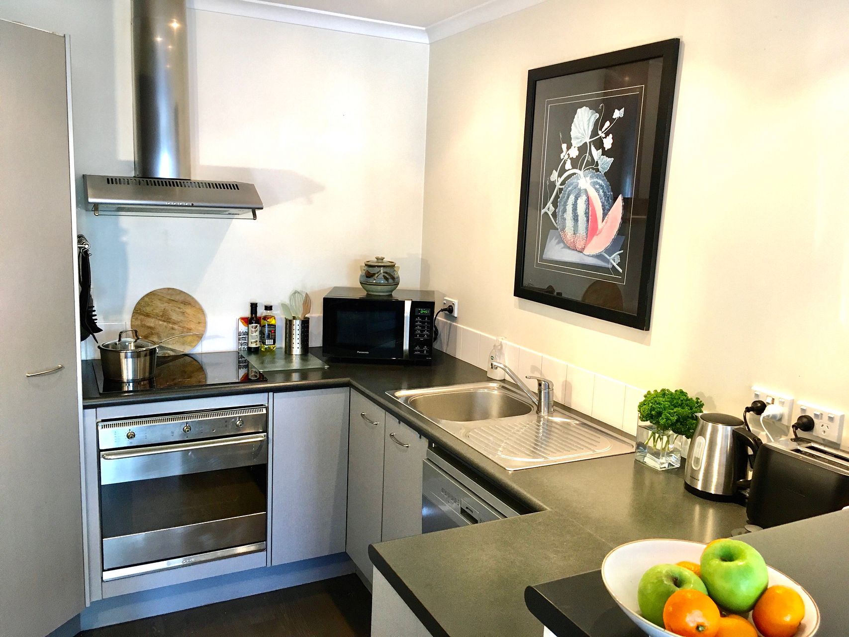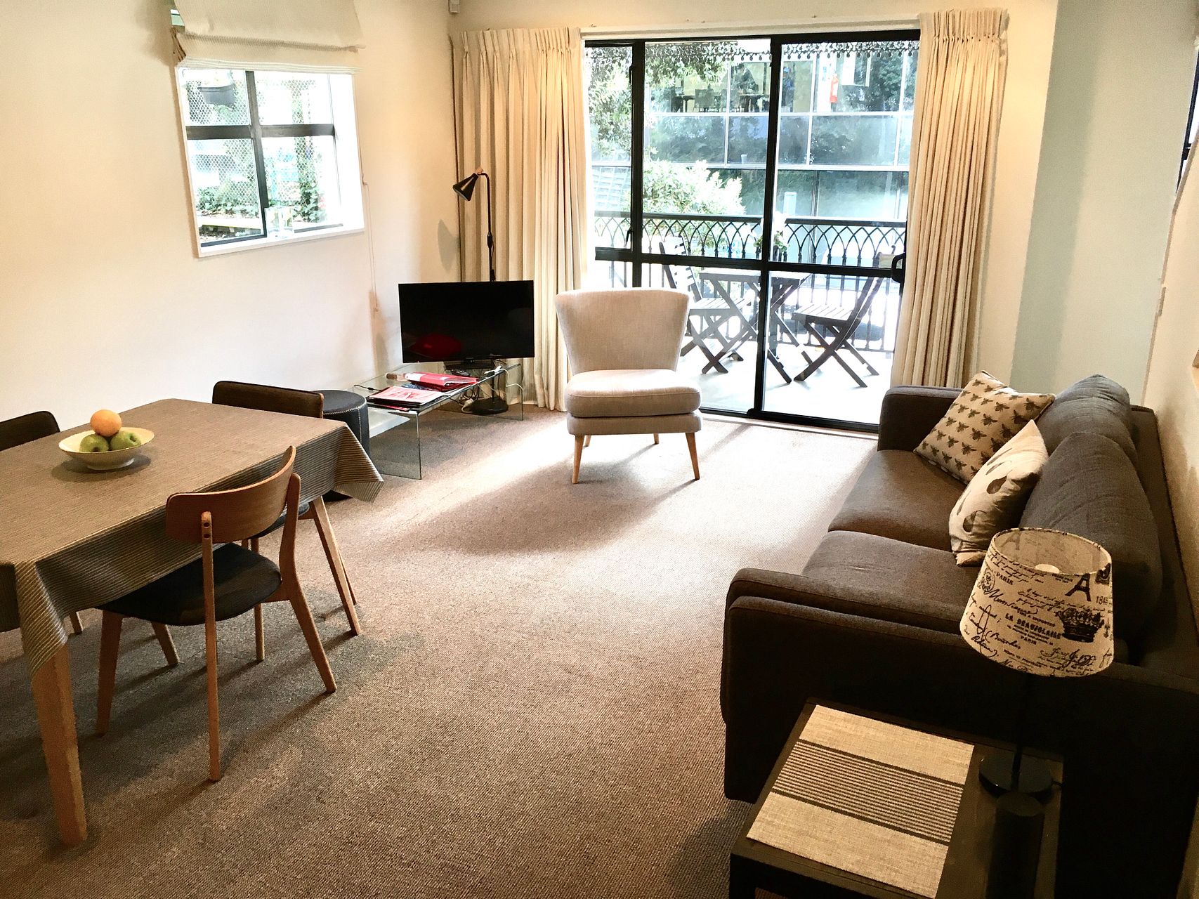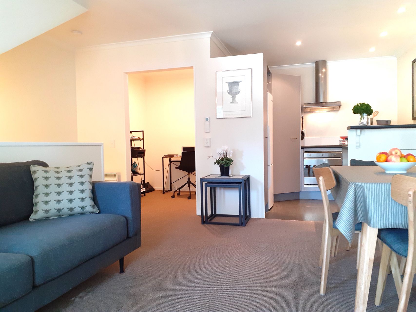 Security features include a monitored fire and intruder alarm system (cost included in rent) a garage with electronic door opener and internal access. A separate office area, fibre broadband and copious storage makes this recently furnished townhouse a serious work-from-home proposition. A fridge/freezer, Smeg dishwasher, hob and oven, a microwave oven, washing machine and airer are also included as well as all furniture shown in photographs. A heat pump, and thermal curtains all help to keep this townhouse warm over the winter months until Summer BBQ weather draws you out onto the front balcony.