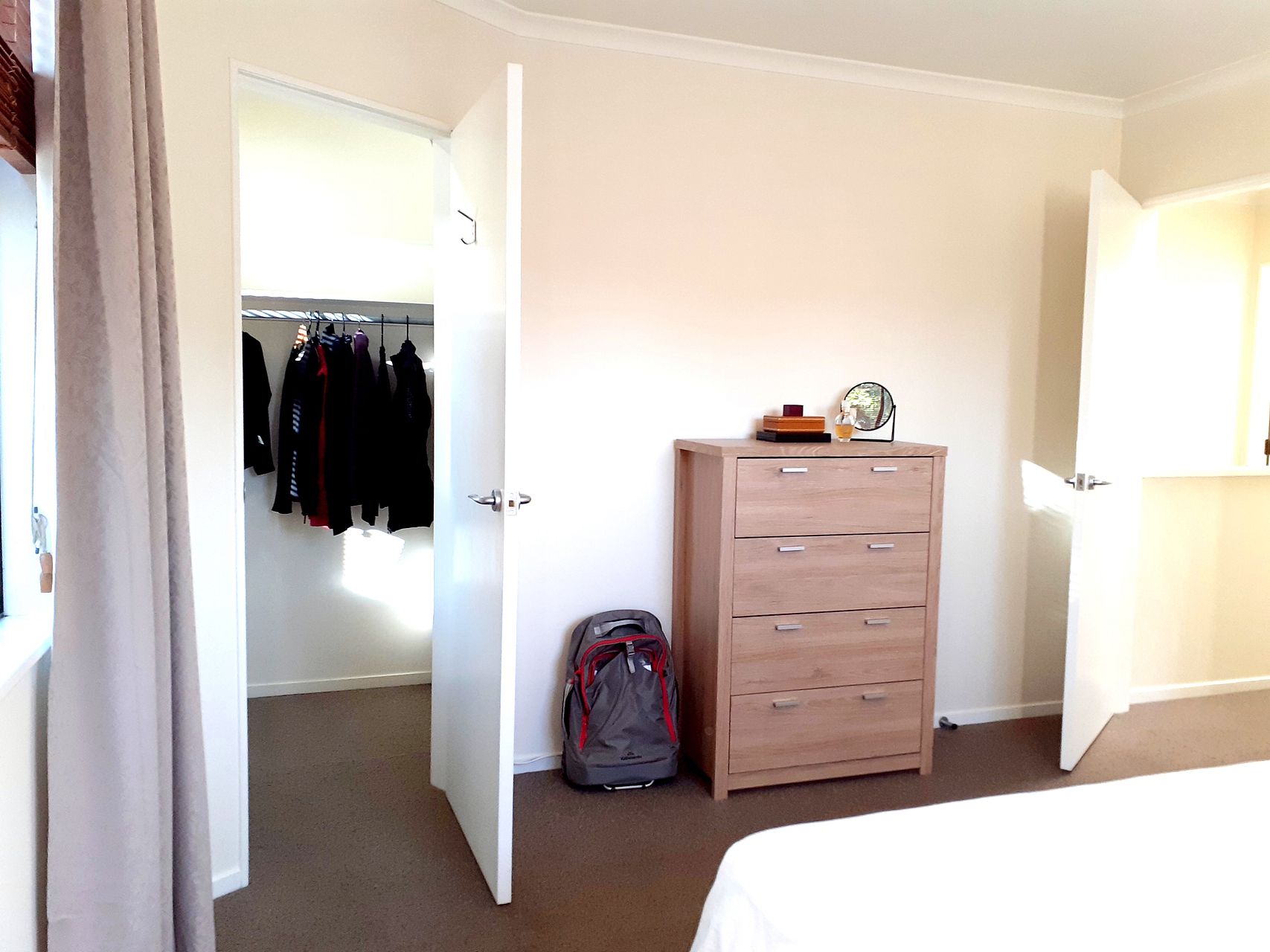 There is a walk in wardrobe in the main bedroom and a built in wardrobe in the second bedroom as well as enough kitchen equipment to get started! Maximum of two professional people.