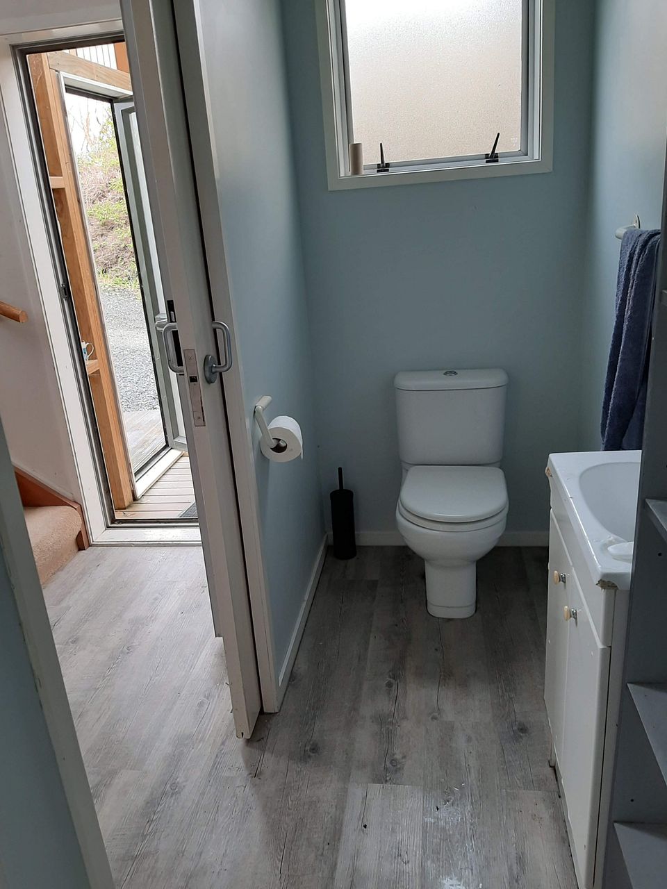 The property comprises an open plan kitchen and living room upstairs with lovely rural view, and one large bedroom. The bathroom and laundry are on the lower level.