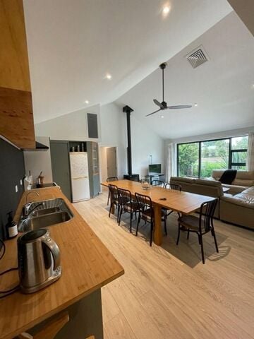 Cozy Comfort: Heated by a metro wood burner and Rinnai gas central heating (timer-equipped and ducted into every bedroom and the laundry) to keep you warm and comfortable.