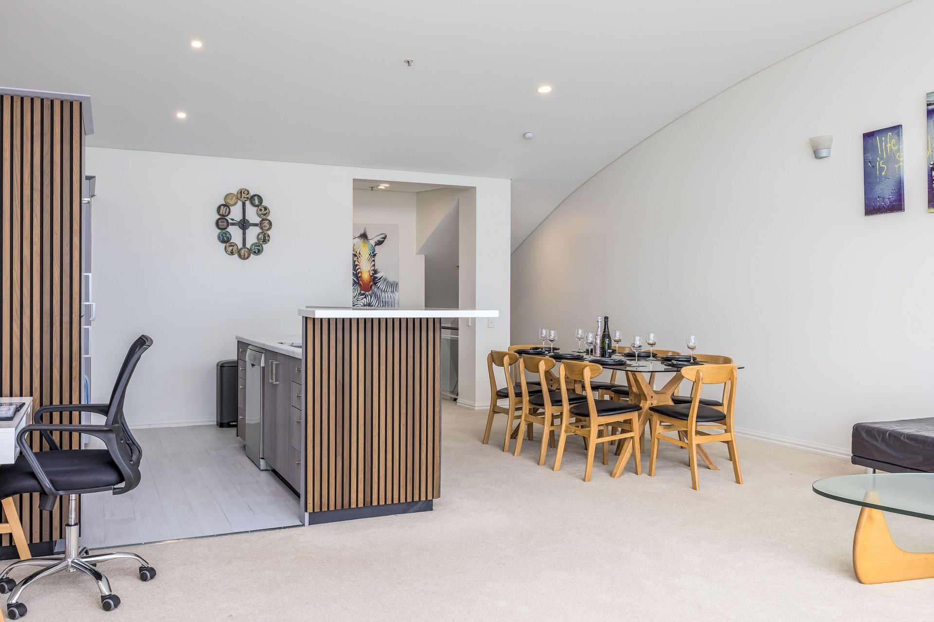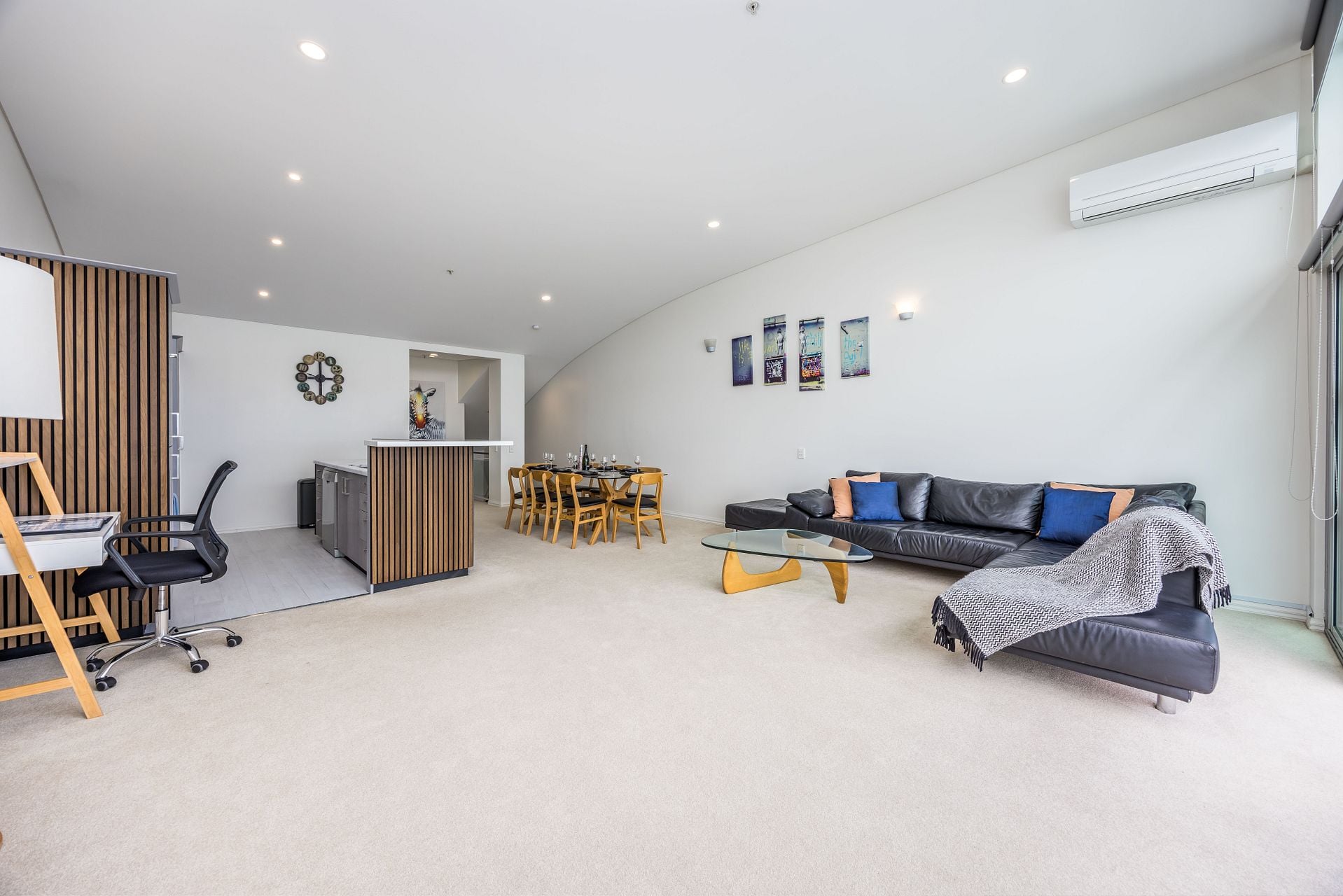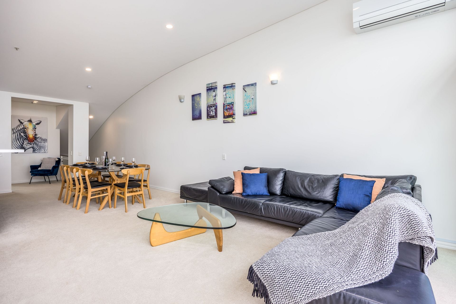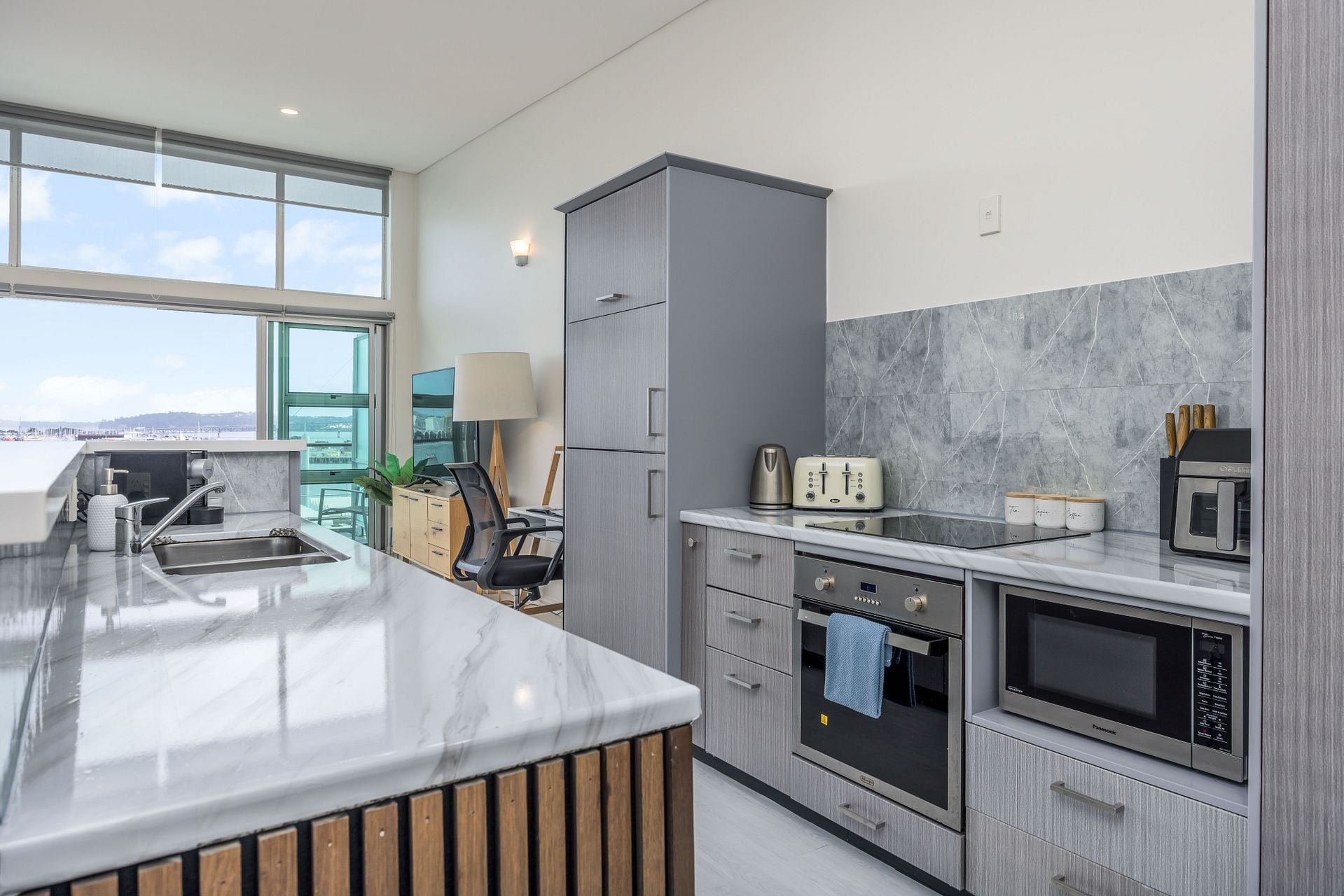 The apartment has air conditioning, Netflix on a 65” TV. The open plan kitchen and living area is great for entertaining and connecting. The kitchen is fully equipped for your needs and enjoyment while you stay with a large fridge/freezer, oven, stove, microwave, dishwasher, and appliances including an electric kettle, 4 slice toaster and a coffee maker.