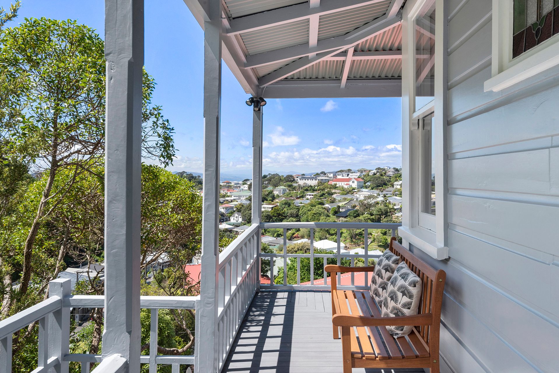 The dining area has an 6-seater dining table and opens up via French doors to an upper deck with outdoor seating with expansive views up the Hutt Valley with a sneak peak of Wellington Harbour, perfect for relaxing after dinner with a coffee or enjoying brunch in the morning sun.