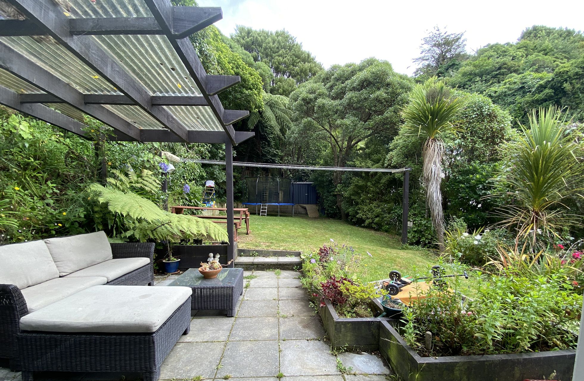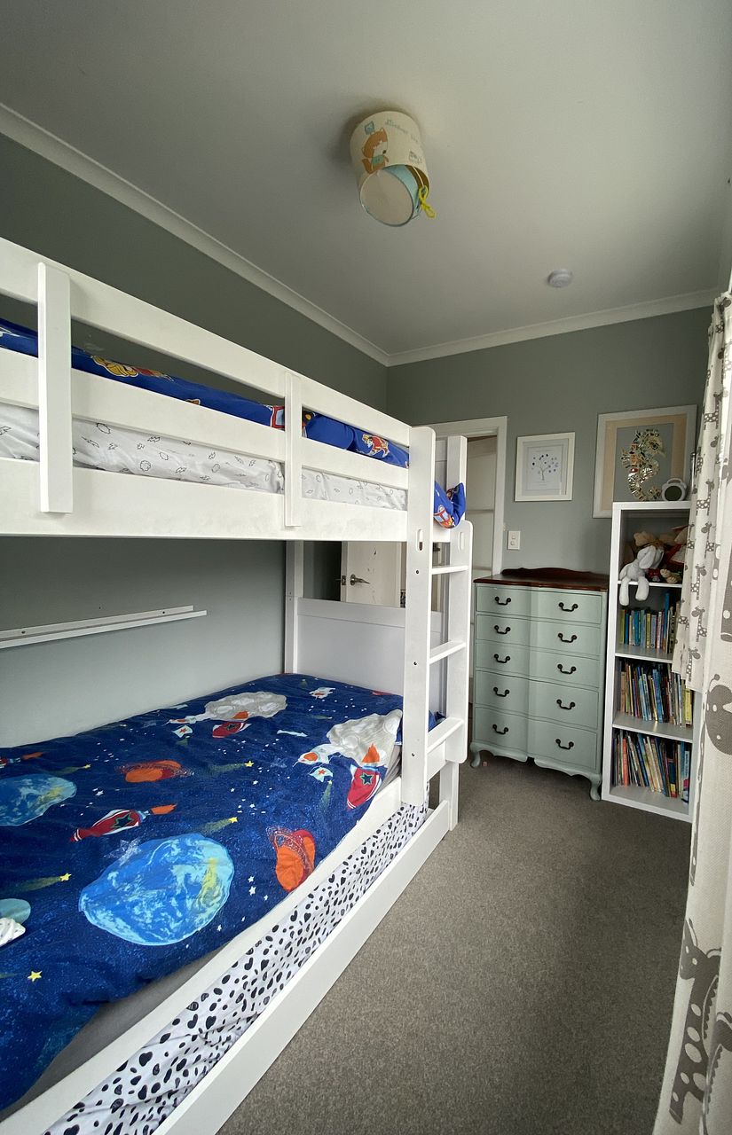 Plenty of outdoor living with multiple outdoor areas, including a front deck, front and back lawns, back patio area and a treehouse out the back. The house has great vistas, amazing sun and the back of the property is surrounded by native bush backing on to Burrows Avenue Park and Wright’s Hill Reserve, native birds often visit from Zealandia.