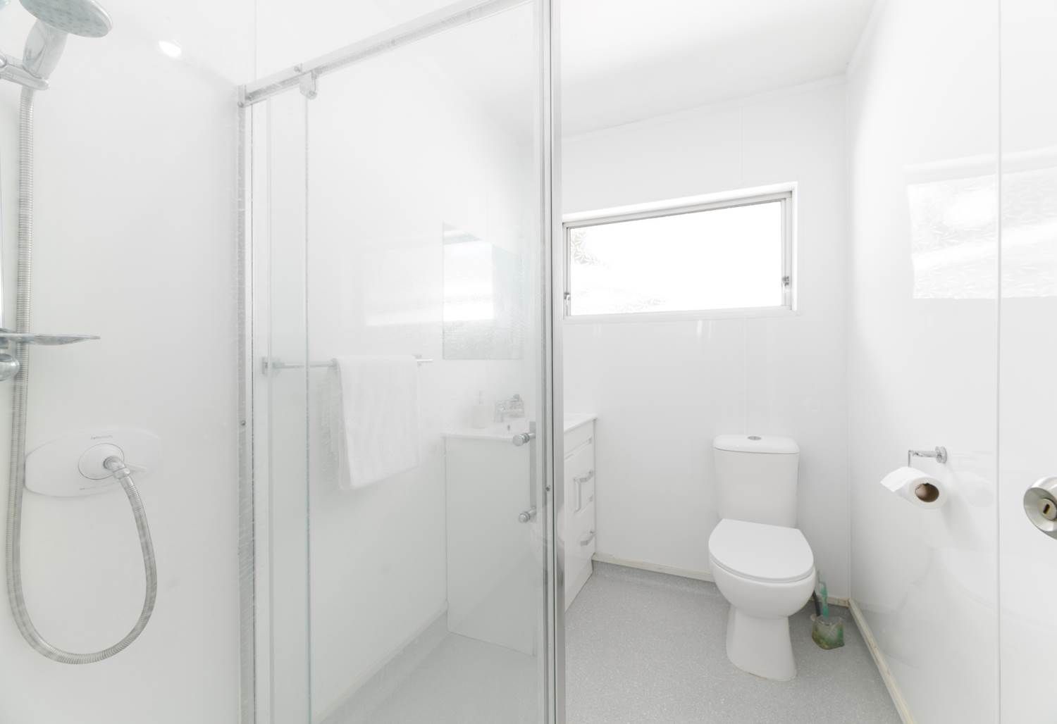 1 bathroom with shower, toilet and an extra toilet with separate access