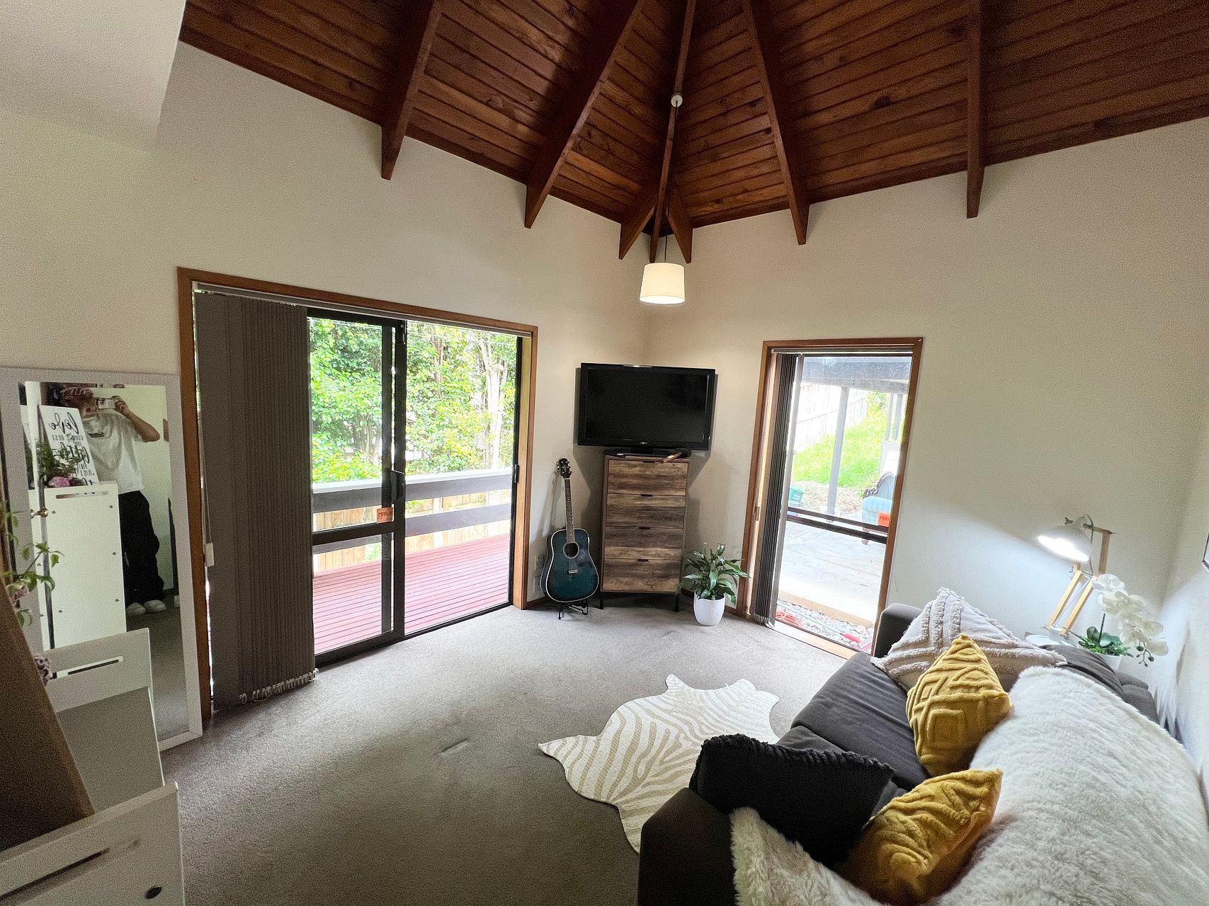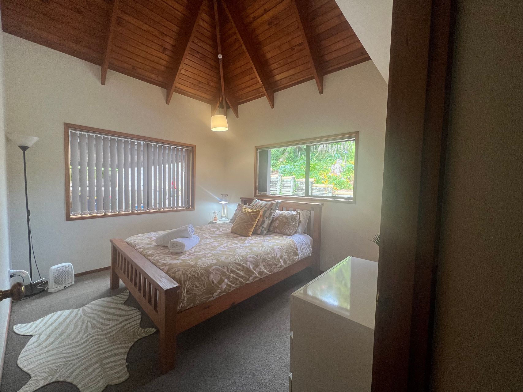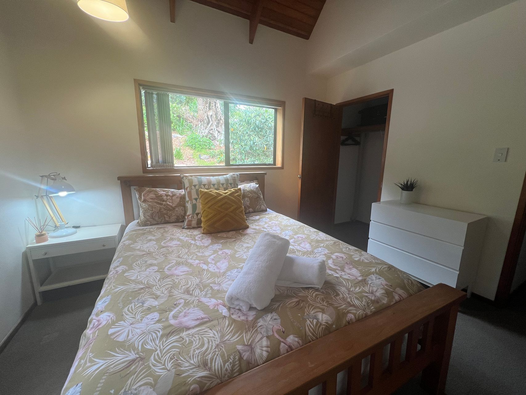 1x large bedroom with Queen Bed, large built-in wardrobe, dresser, mirror and desk.