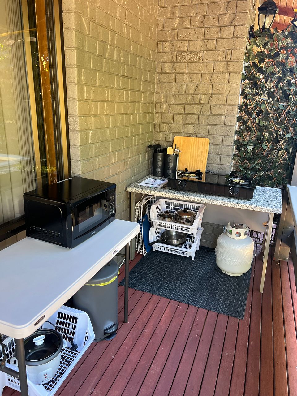 Outdoor Bbq and 2 burner gas hob (no oven) kettle, toaster, microwave, large fridge/freezer
