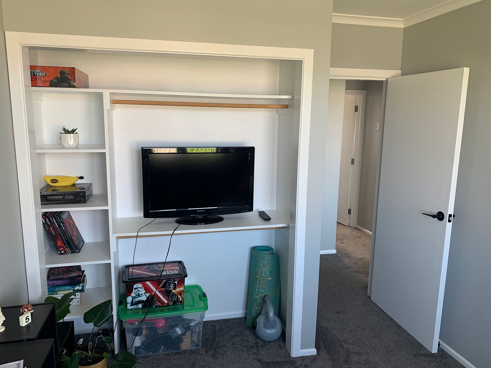 Semi-furnished: large wall-mounted TV, fridge-freezer, sofa, washing machine, dishwasher, dryer, microwave, dining table, kitchen stools, kitchen appliances, bookshelves and storage.