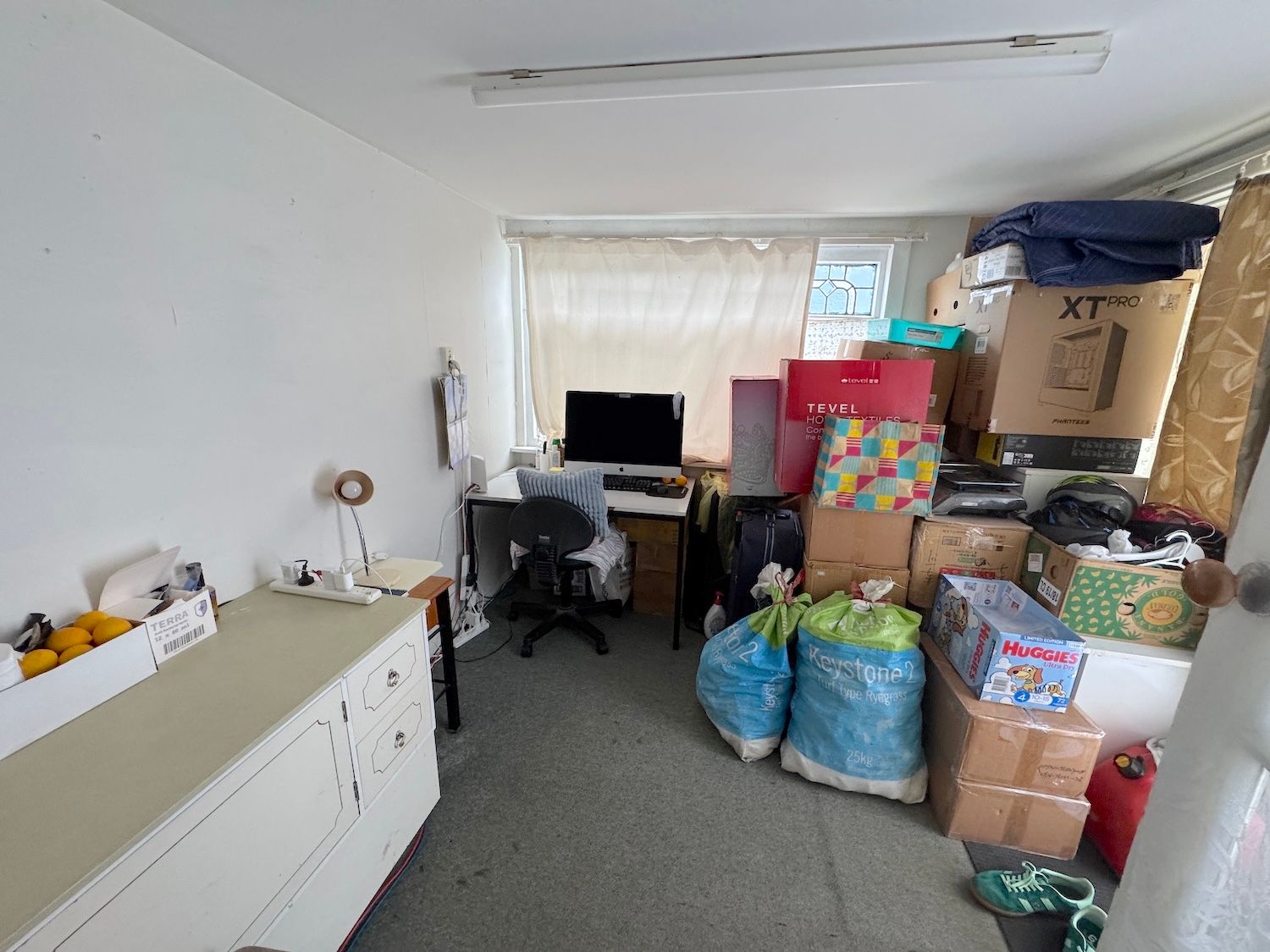 A garage is reserved as the property owners' storage space, there is one car's parking space in front of it. on property parking space