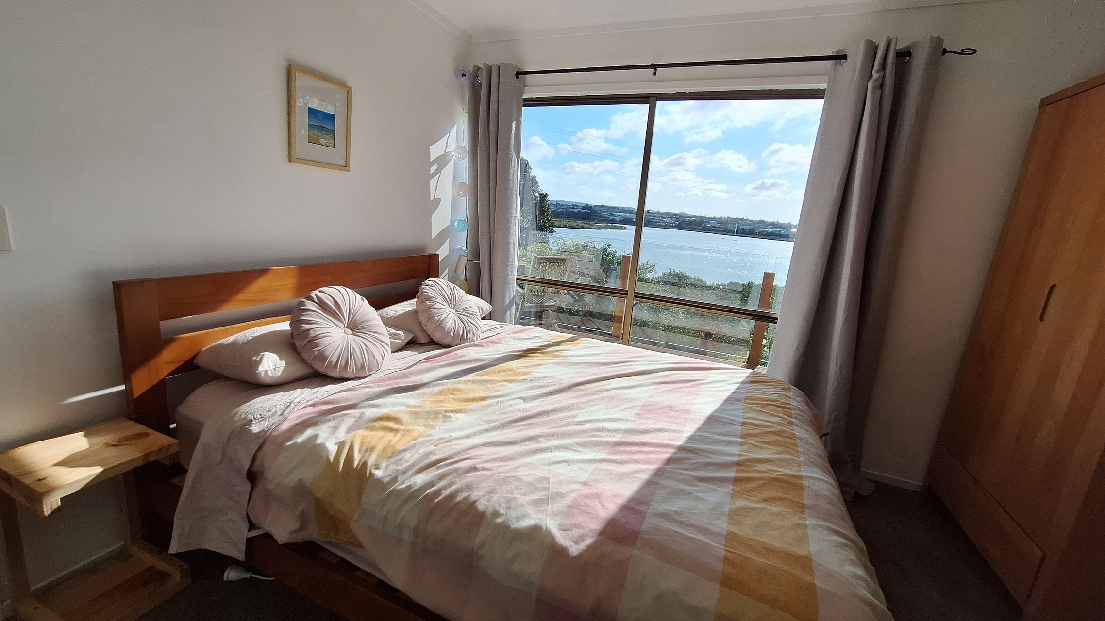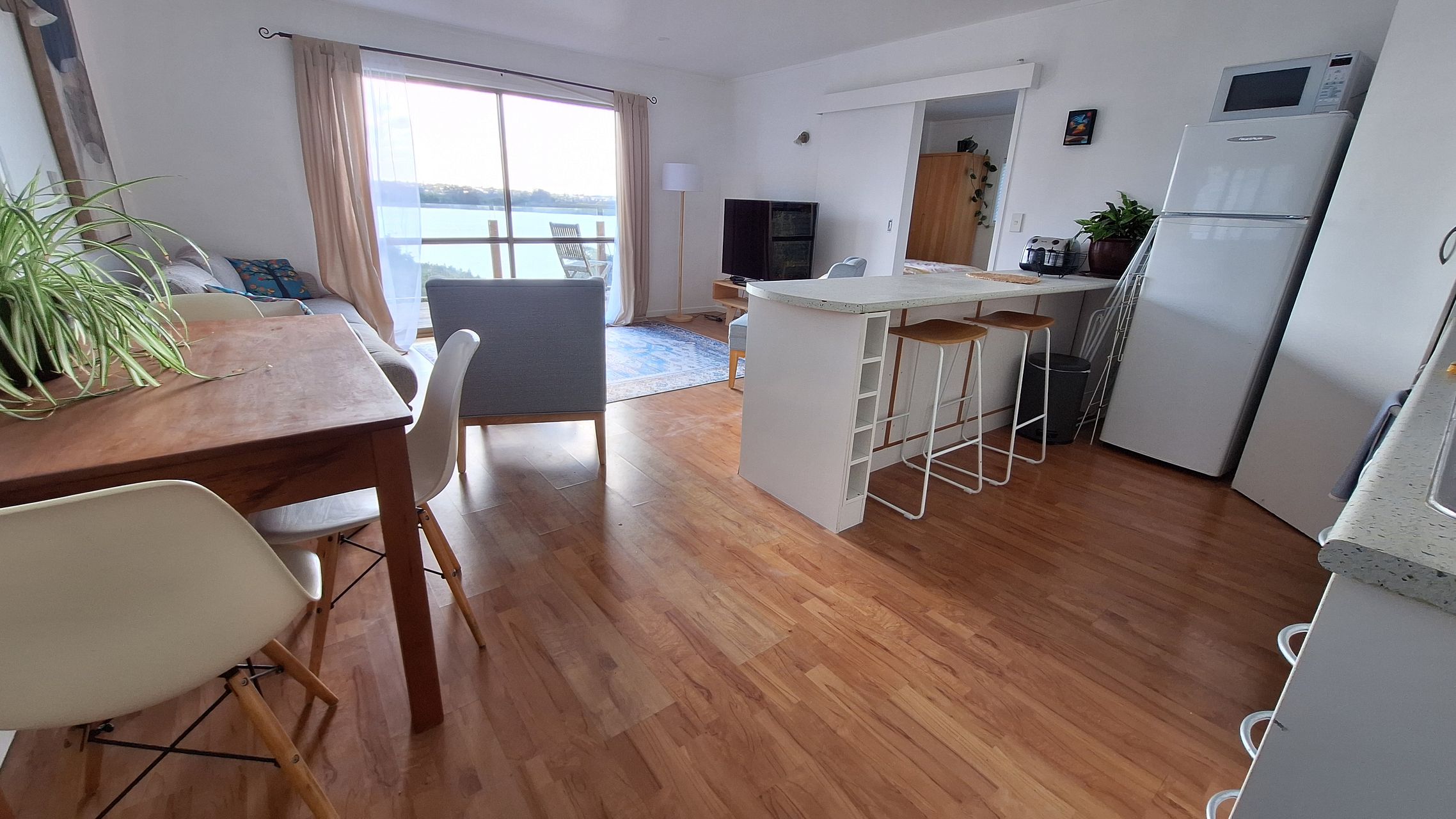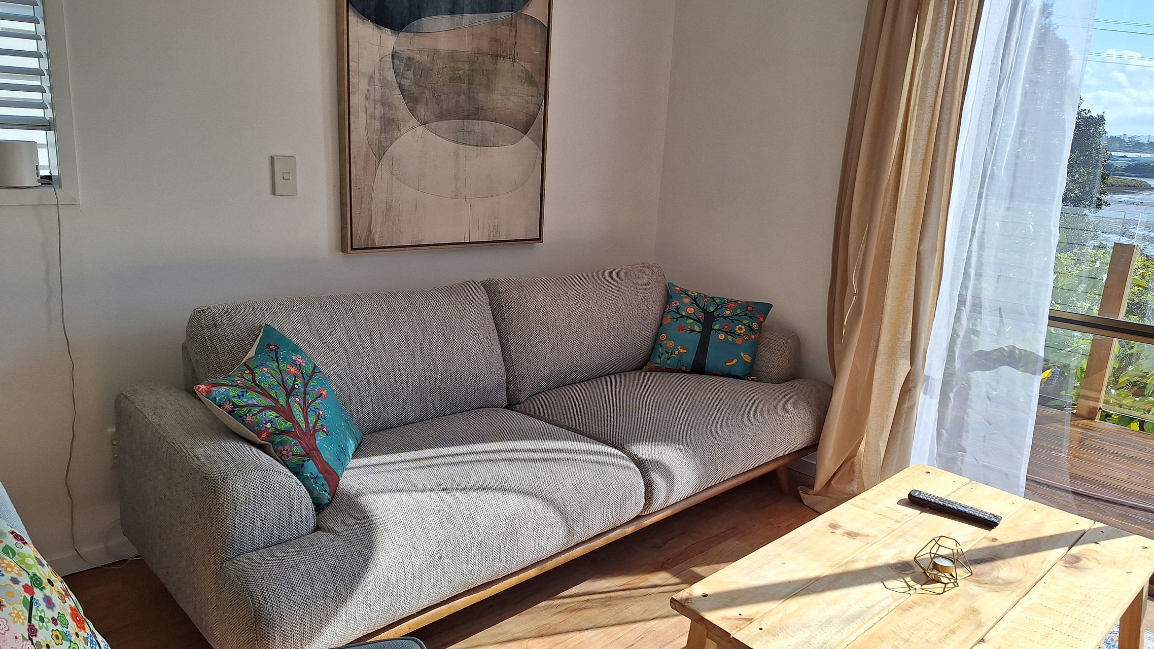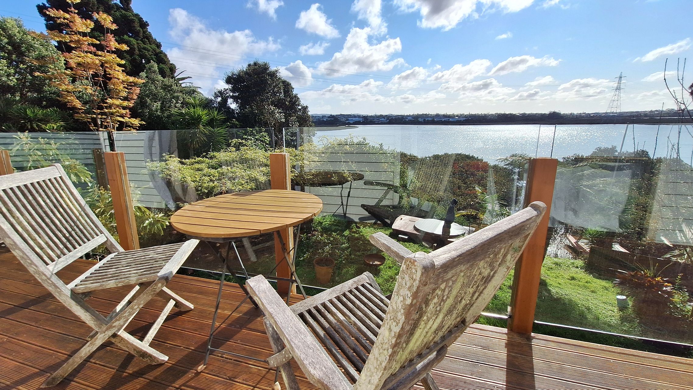 Deck/balcony overlooks shared garden, with views of the Whau estuary and faces West with afternoon sun and sunset views.