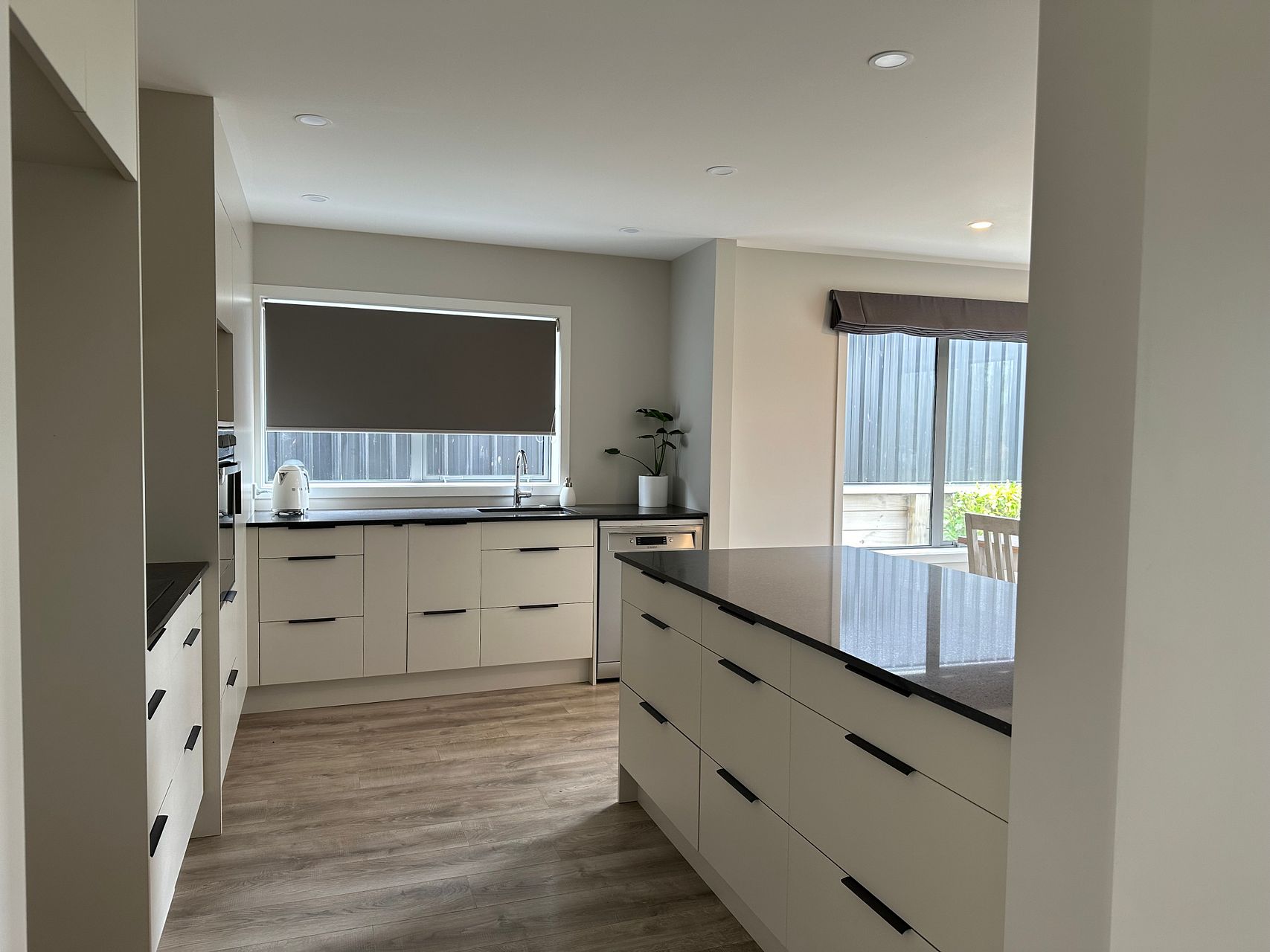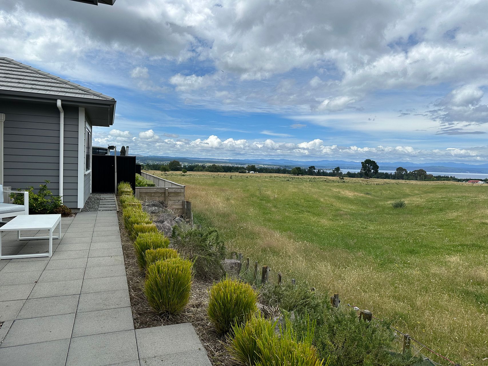 A spacious, sunny kitchen at the front with a patio for morning coffee. Out of the lounge double ranch slider is a large paved area, perfect for sitting back with a quiet drink as you take in the afternoon sunshine whilst enjoying the farm and lake aspects.