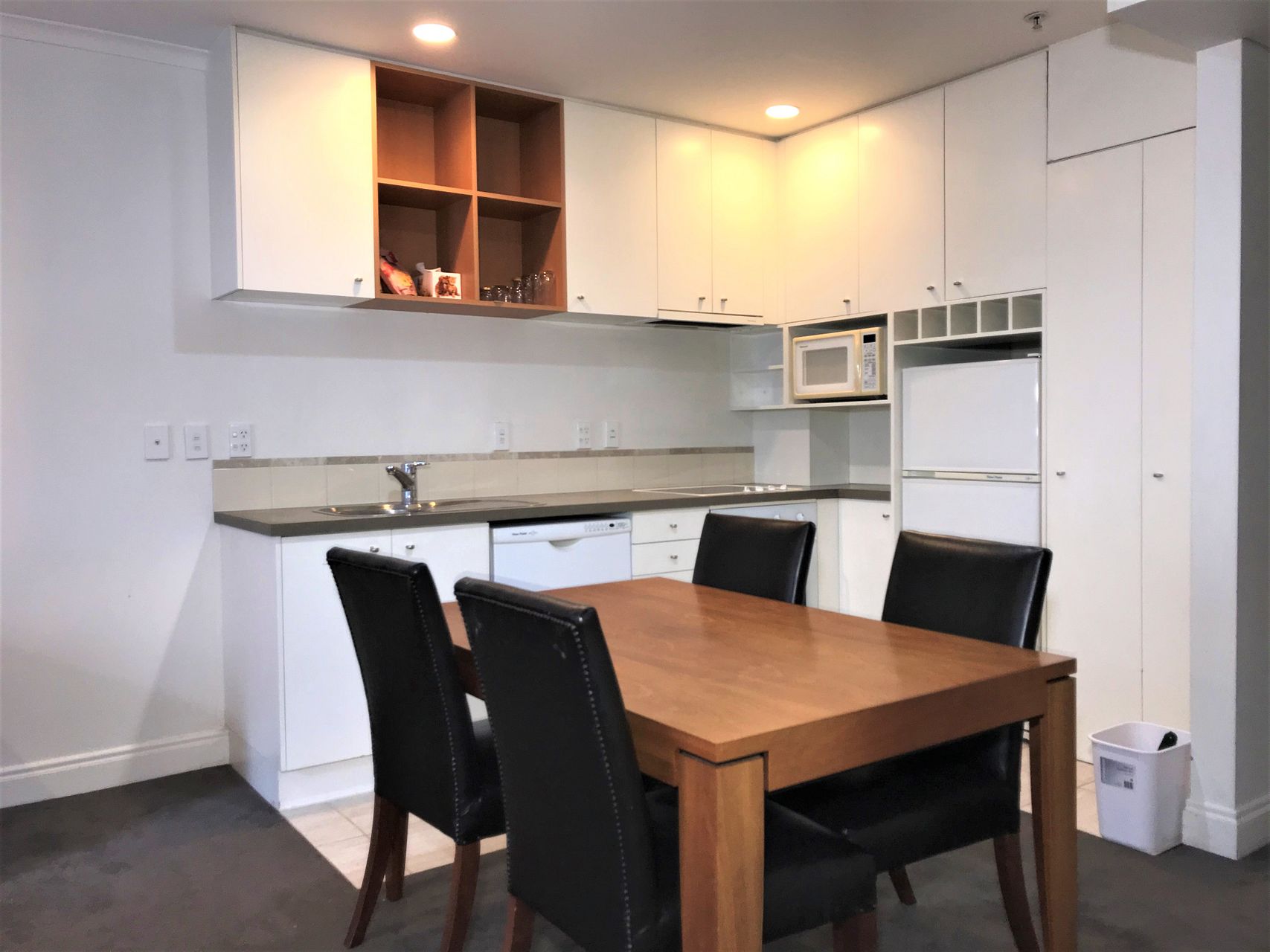 Comes with everything, TV, Lounge suite, Dining table & Chairs, full kitchen, dishwasher, microwave, plates , cups etc..just bring a bag and your away with city living. (48sqm apartment with double bedroom)