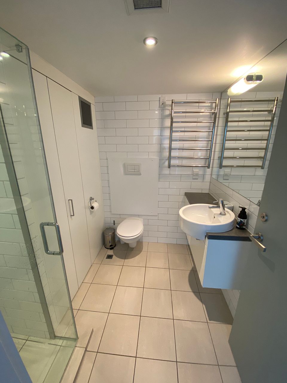 Tiled bathroom with underfloor heating, heated towel rail, shower and designated laundry with washing machine/dryer.