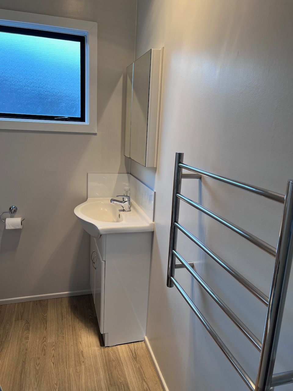 Bathroom includes a shower, built-in mirror cabinet, heated towel rail and heat-lamp extraction fan