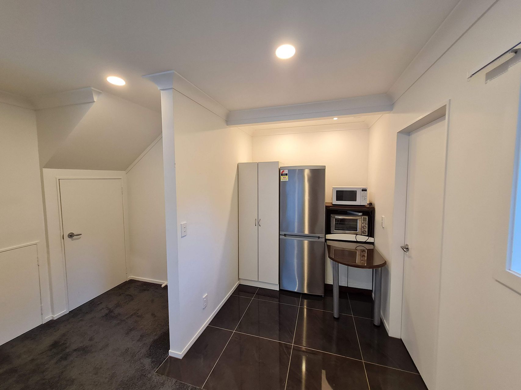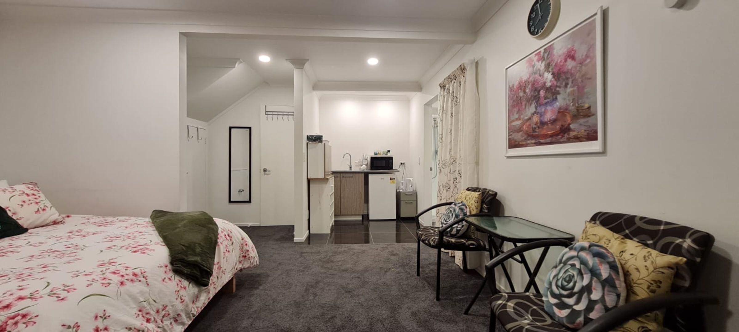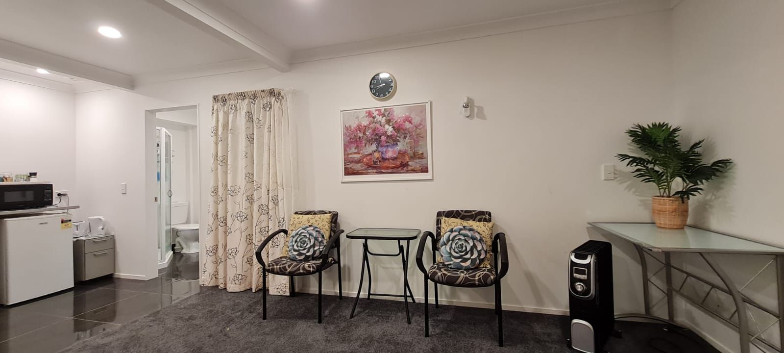 This double-glazed, modern studio room has new carpet and a newly tiled ensuite with its own courtyard.