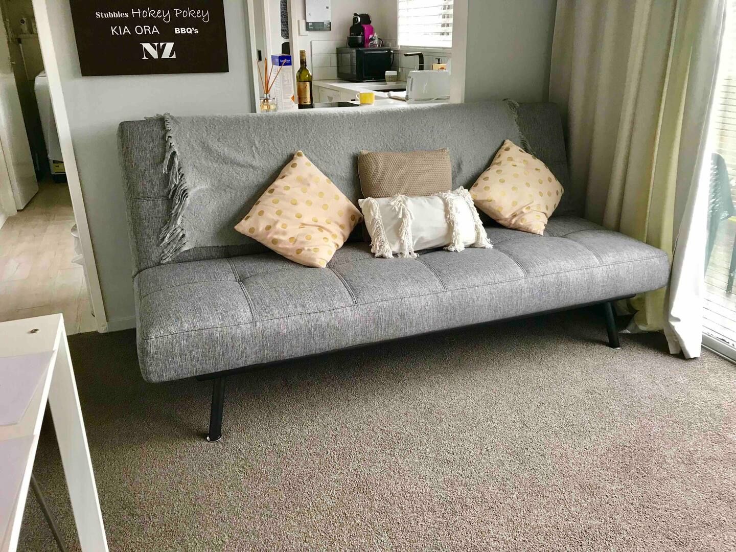 The flat has newish carpet, a newish kitchen and bathroom vanity and is freshly decorated, bedroom has 1 x king bed, wardrobe, sofa bed, flat screen TV with sky - spacious flat with your own laundry, kitchen & bathroom.
