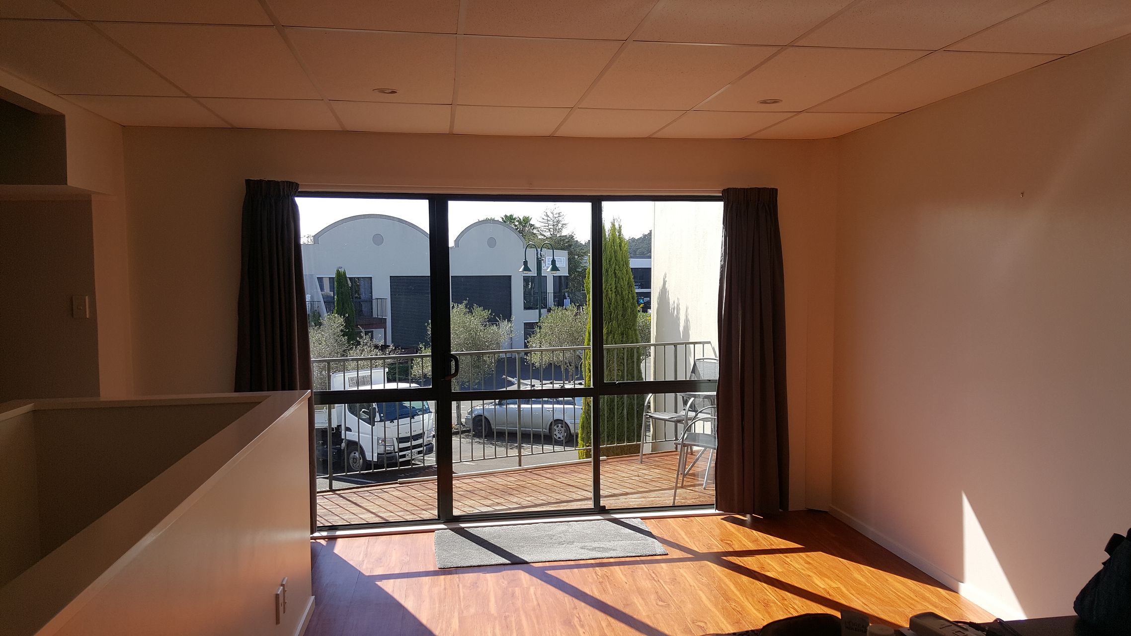 Upstairs - Balcony, Kitchen, Dining, Lounge, Large Bedroom with open plan Bathroom.