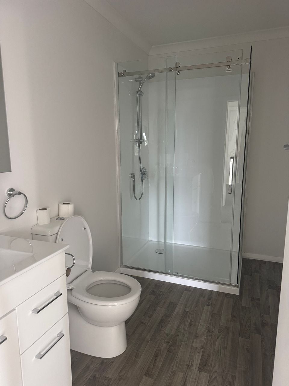 Bathroom: New stylish bathroom with a standalone shower and toilet.