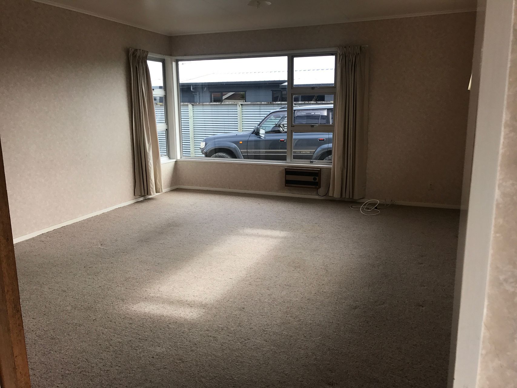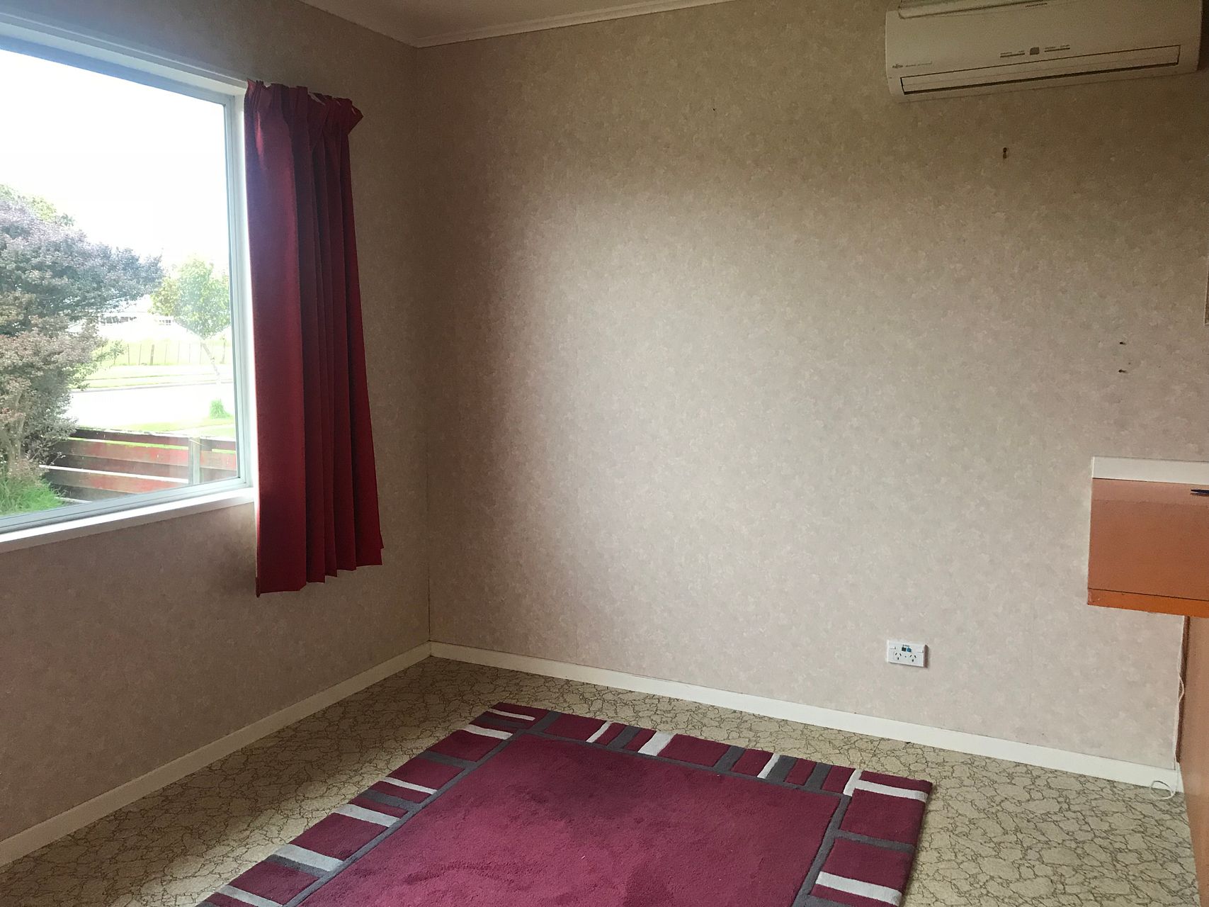 The lounge room is large with drapes and a heat pump heats the kitchen, dining and lounge.