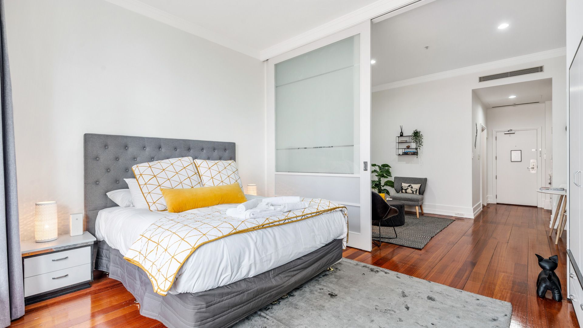 The bedroom is equipped with a brand new Queen-sized bed as well as a wardrobe, working space and electronic safe.