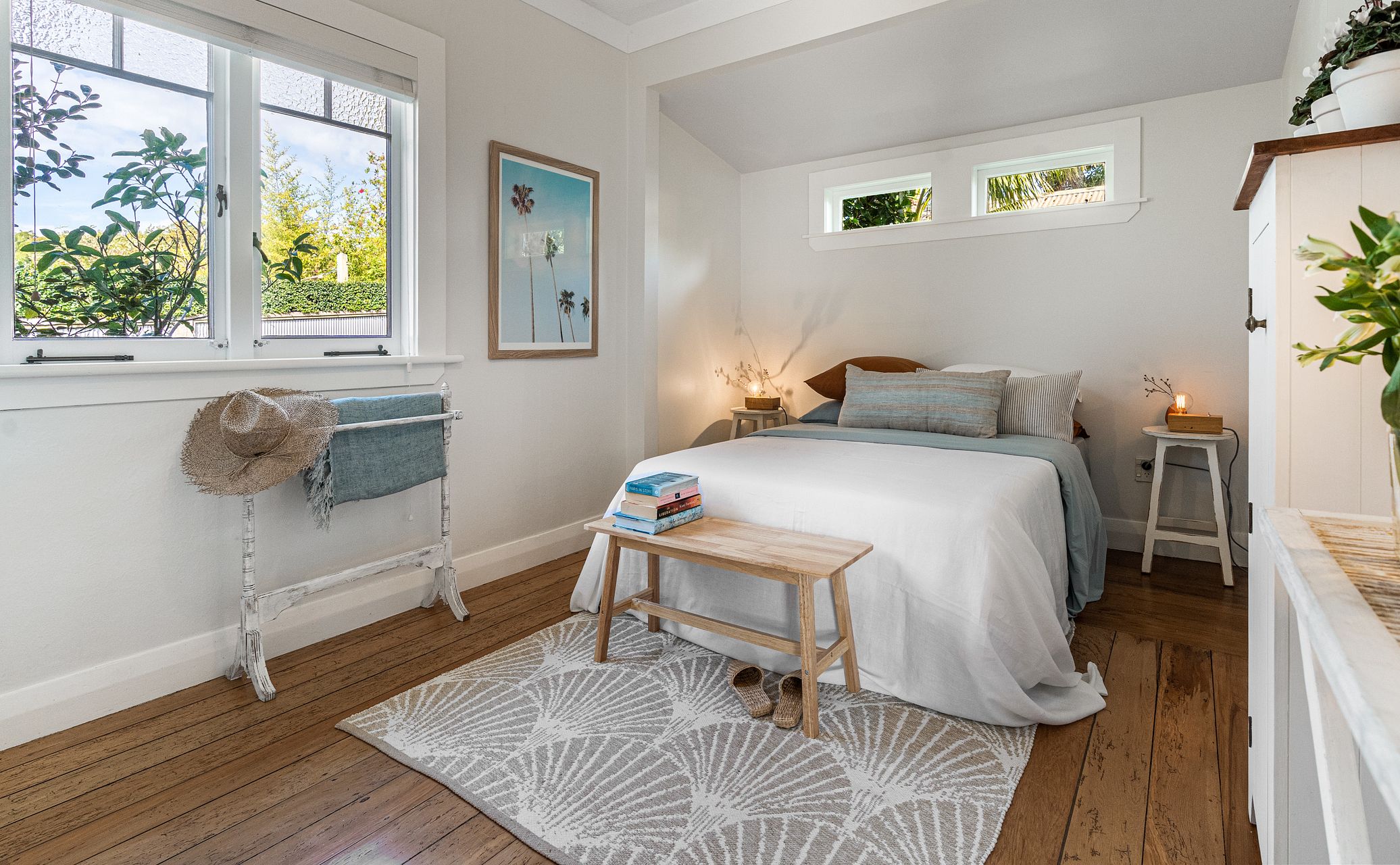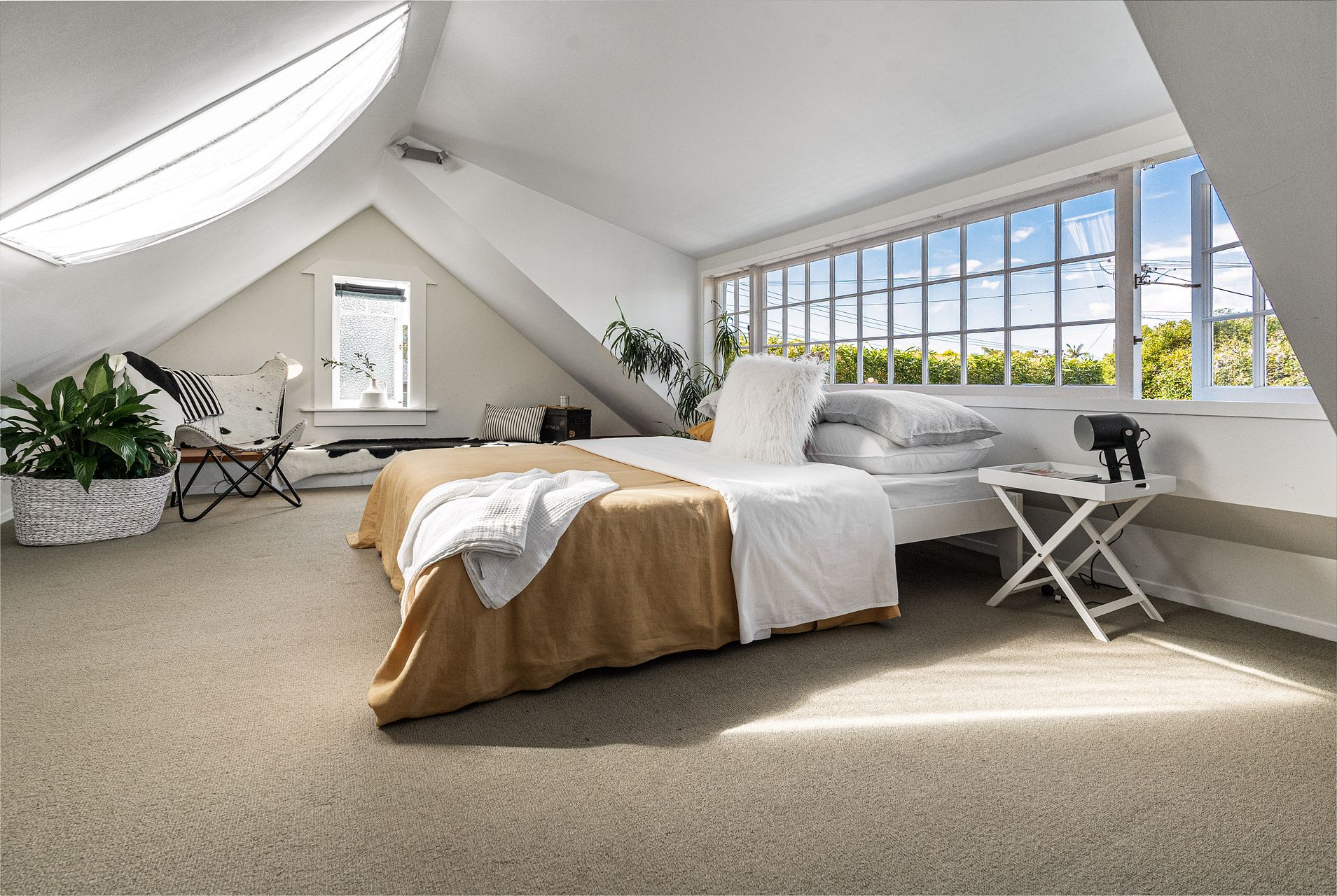 One double and one single bedroom with built-in wardrobes and one bathroom are in the main house and one large attic bedroom with ensuite is in the sleepout above the garage.