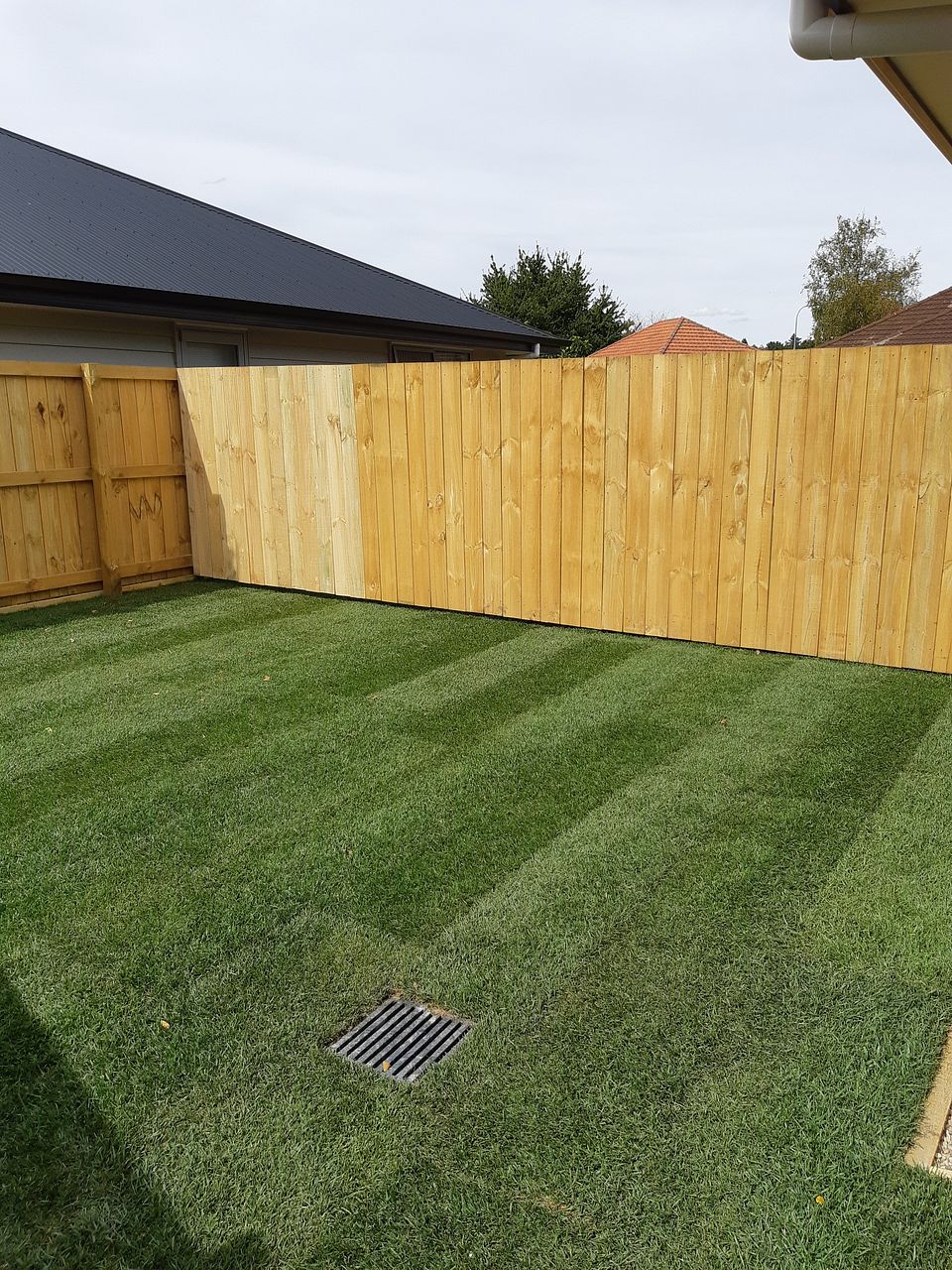 North facing, with outside deck, grass area and side path with clothes line.