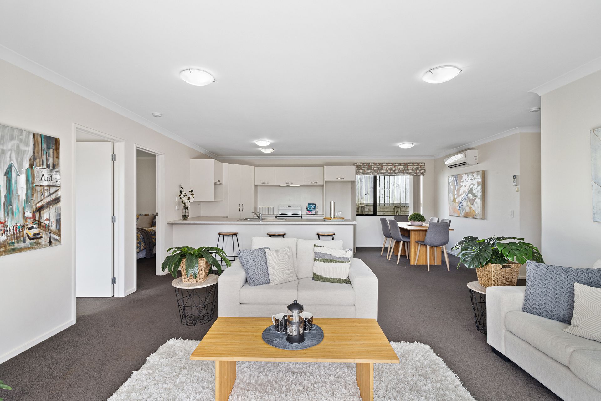 Low maintenance, double glazed, brick home includes spacious open plan kitchen/dining/living with heat pump for year-round comfort.