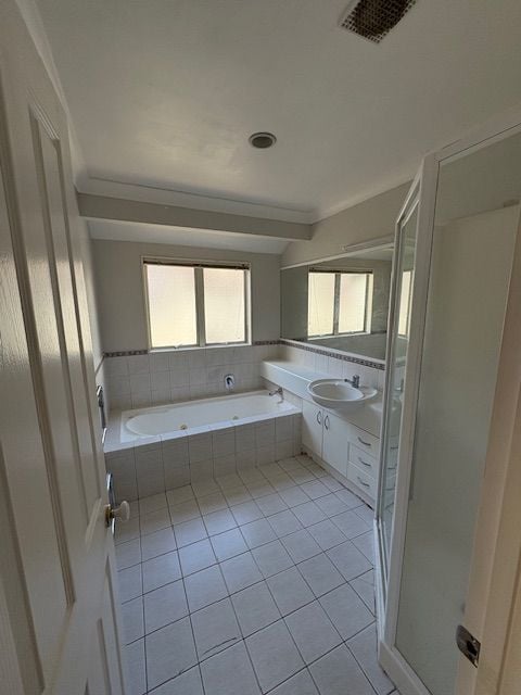 The property offers five generous bedrooms, including a master suite with ensuite and walk-in wardrobe, three full bathrooms, two separate living areas, and a double internal-access garage.