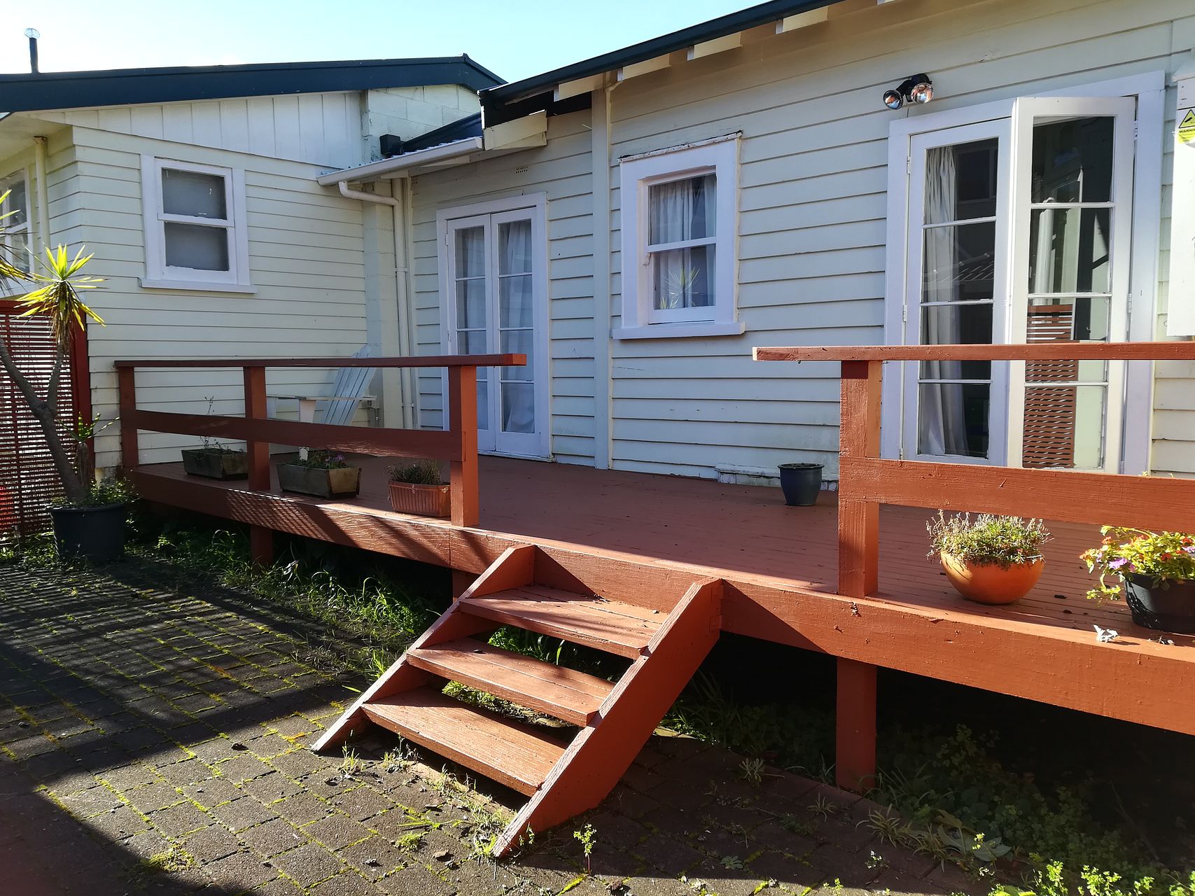 Both bedrooms have double doors that open to a private deck and courtyard, ideal for relaxing or light gardening in the low-maintenance yard.