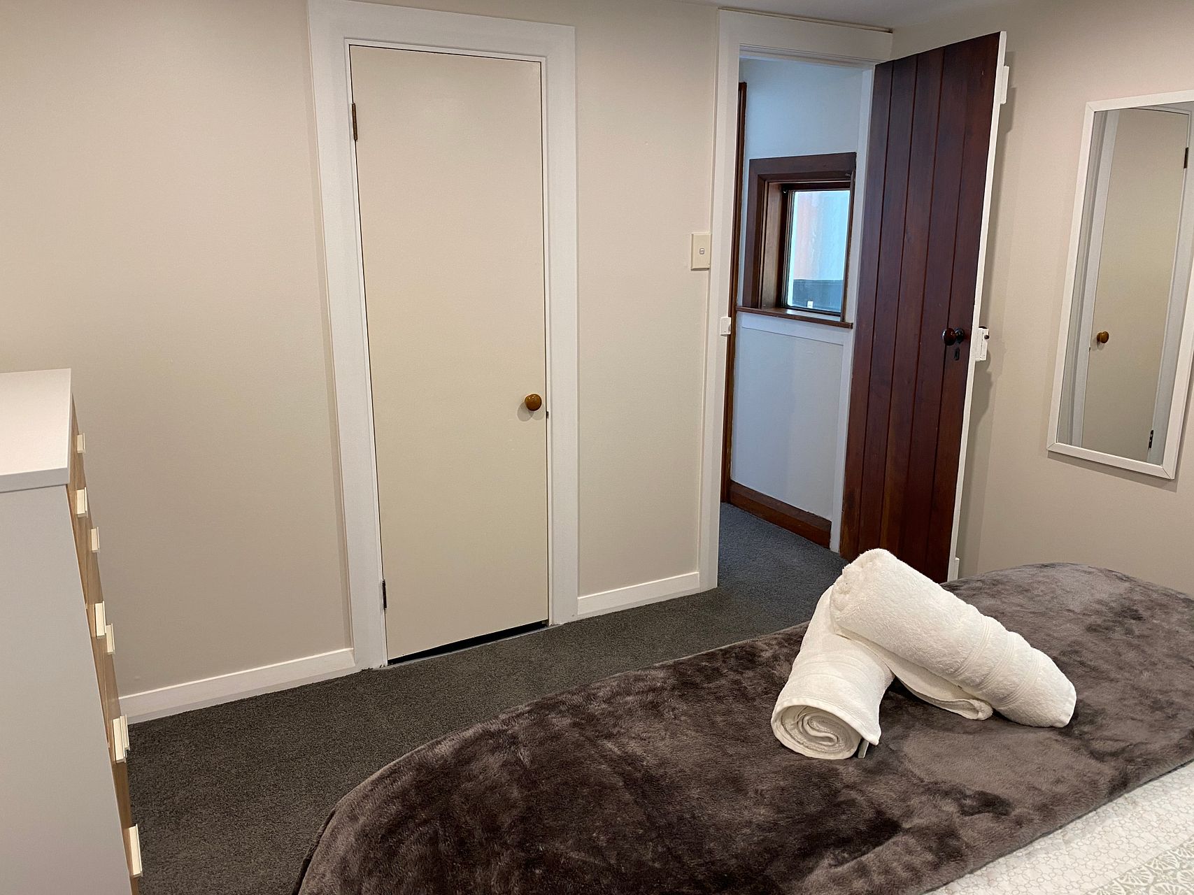 The bedroom has a double glazed window, a queen bed with bedding, chest of drawers, bedsides, lamps and a built in wardrobe with coat hangers, light and wardrobe heater,