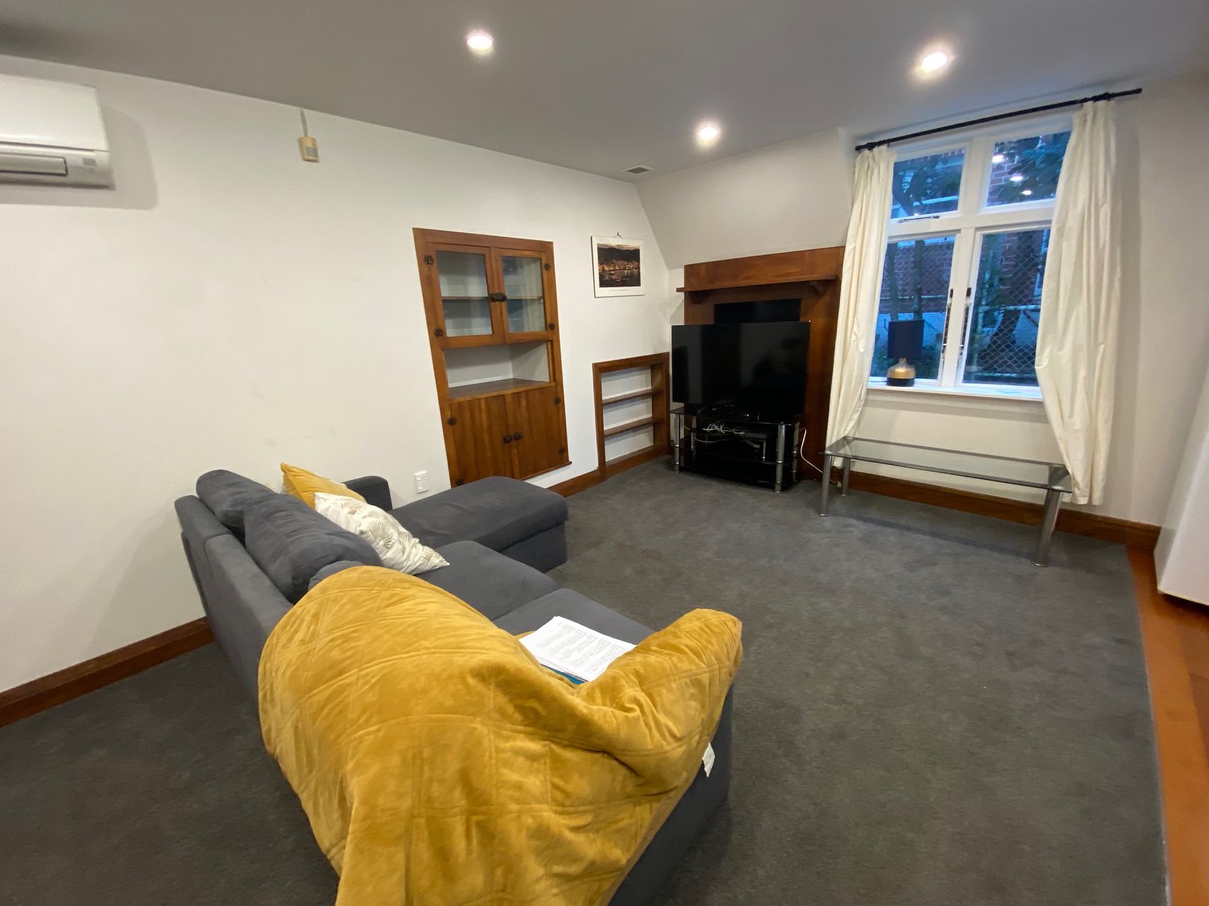 Carpeted and heated this flat is cozy and would suit one or two tenants. The lounge is large with a couch and large smart TV. It has a few different storage areas too.