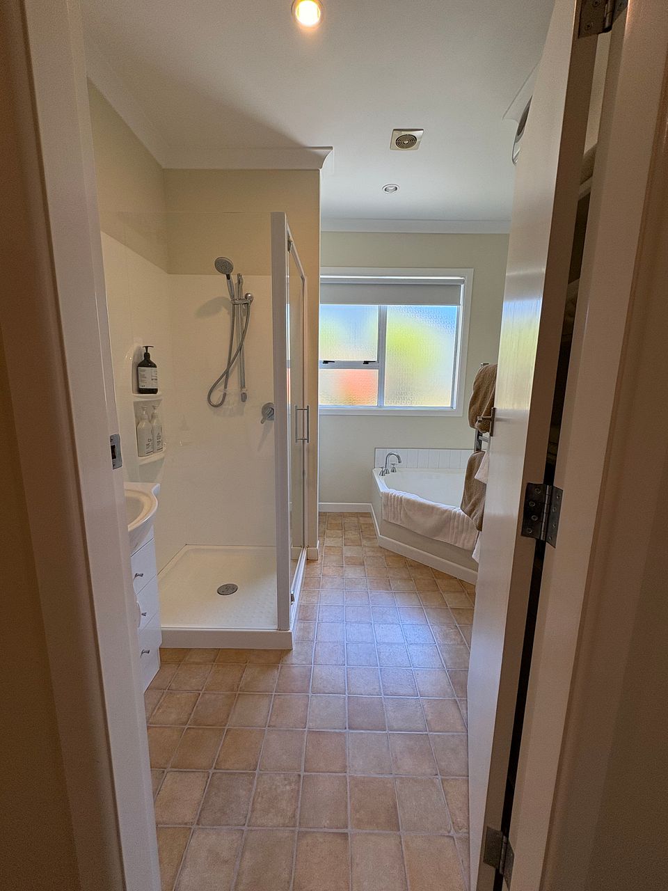 The light and bright bathroom includes an extra large bathtub with separate shower.