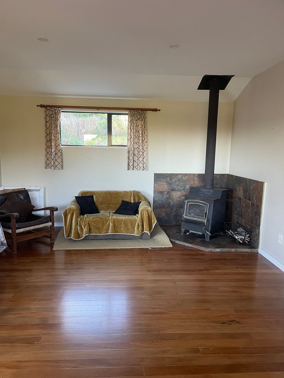 2 bedrooms at one end, with bathroom. Down the hallway into open plan kitchen, living & dining with rimu polished floors.