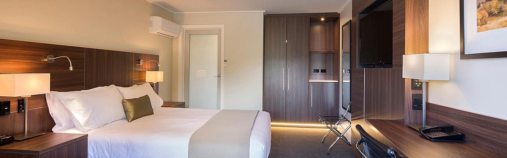 En-suite bedroom with king bed, tea/coffee making facilities, mini-fridge, cupboard, rain shower, work desk and a comfy chair, air conditioning, HD TV with sky package and free Wi-Fi. Room is serviced once a week with linen and towels replaced. Cooking facilities are not available in the room