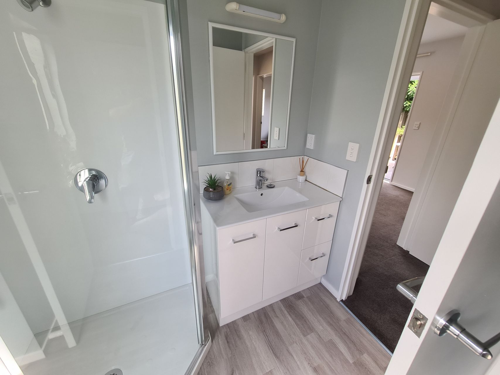 Bathroom has a shower, fan heater, a heated towel rail and new toilet.