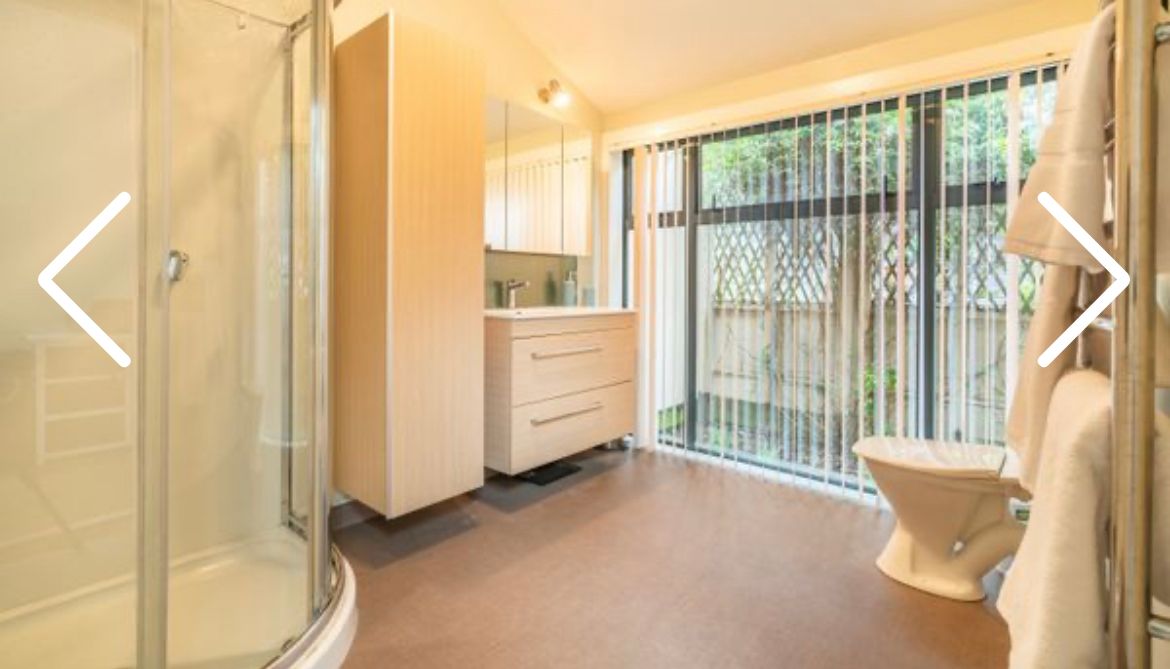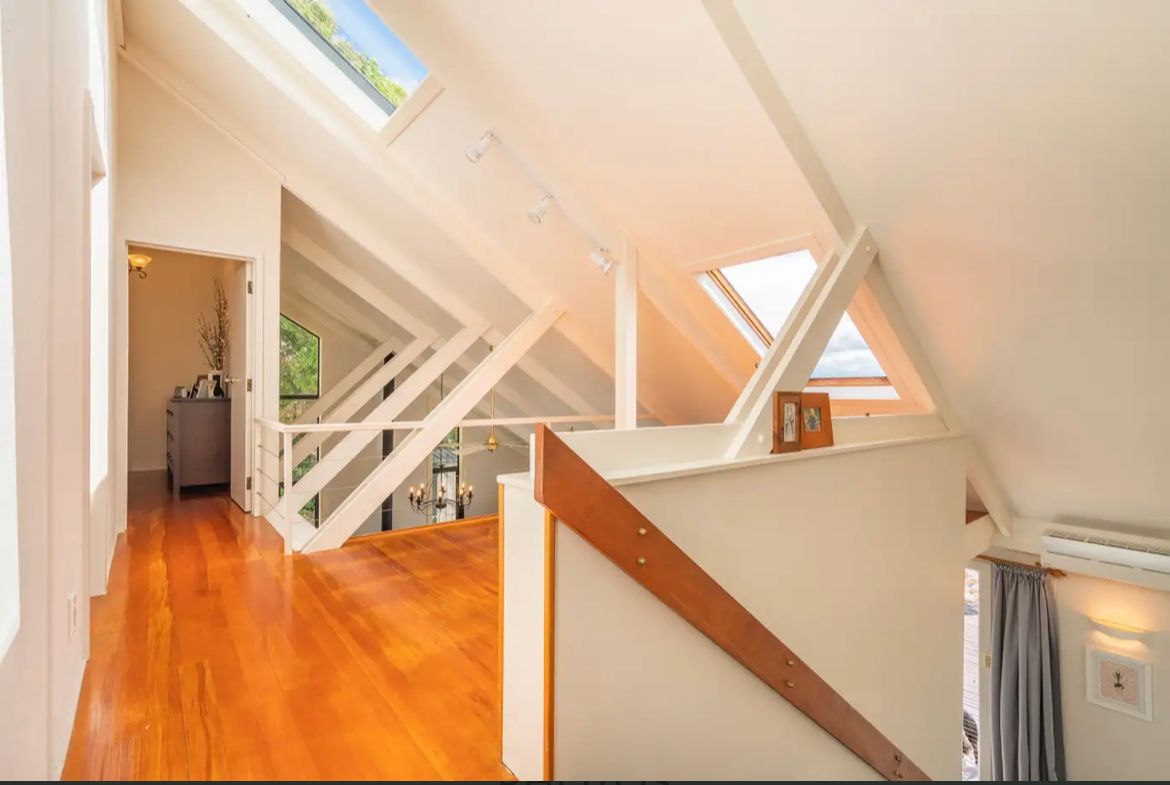 On upper level there are bedrooms, family bathroom and office space. On lower level spacious living room with adjacent dinning area and open modern kitchen. Living room, dining area open to large outdoor deck. All day sun, sheltered from wind.