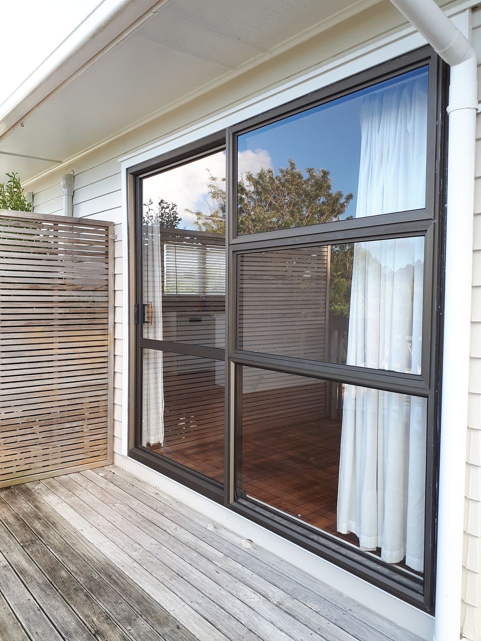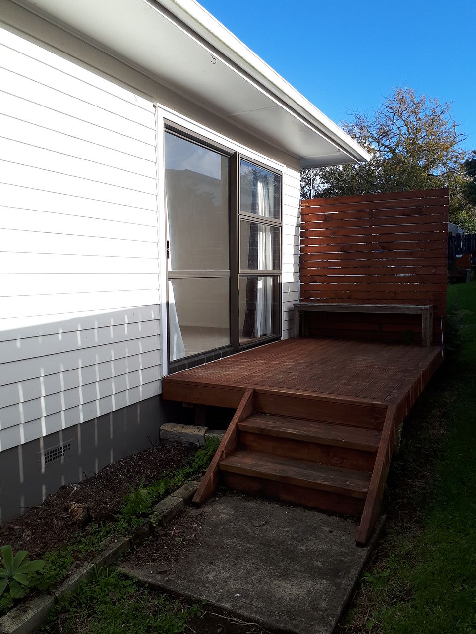 Ranchslider from lounge opens on to a sunny deck. Heat pump in the lounge. The master bedroom has a ranchslider that opens onto a sunny private deck. The other 2 bedrooms are single rooms. All bedrooms have wardrobes. There is a separate linen cupboard.