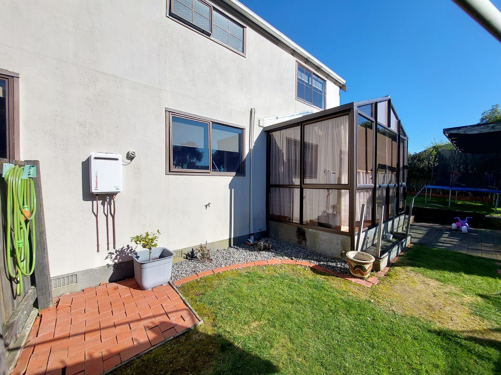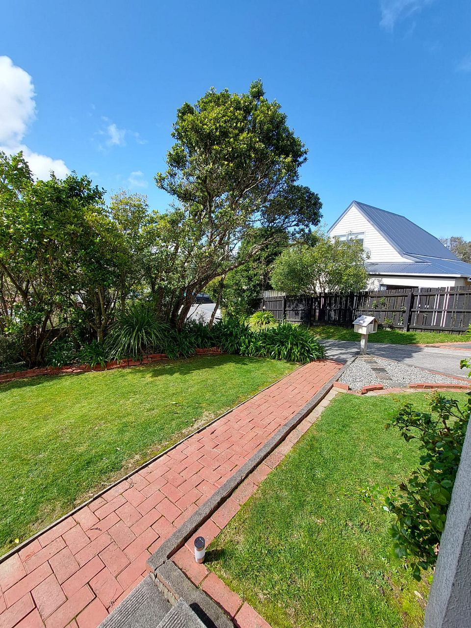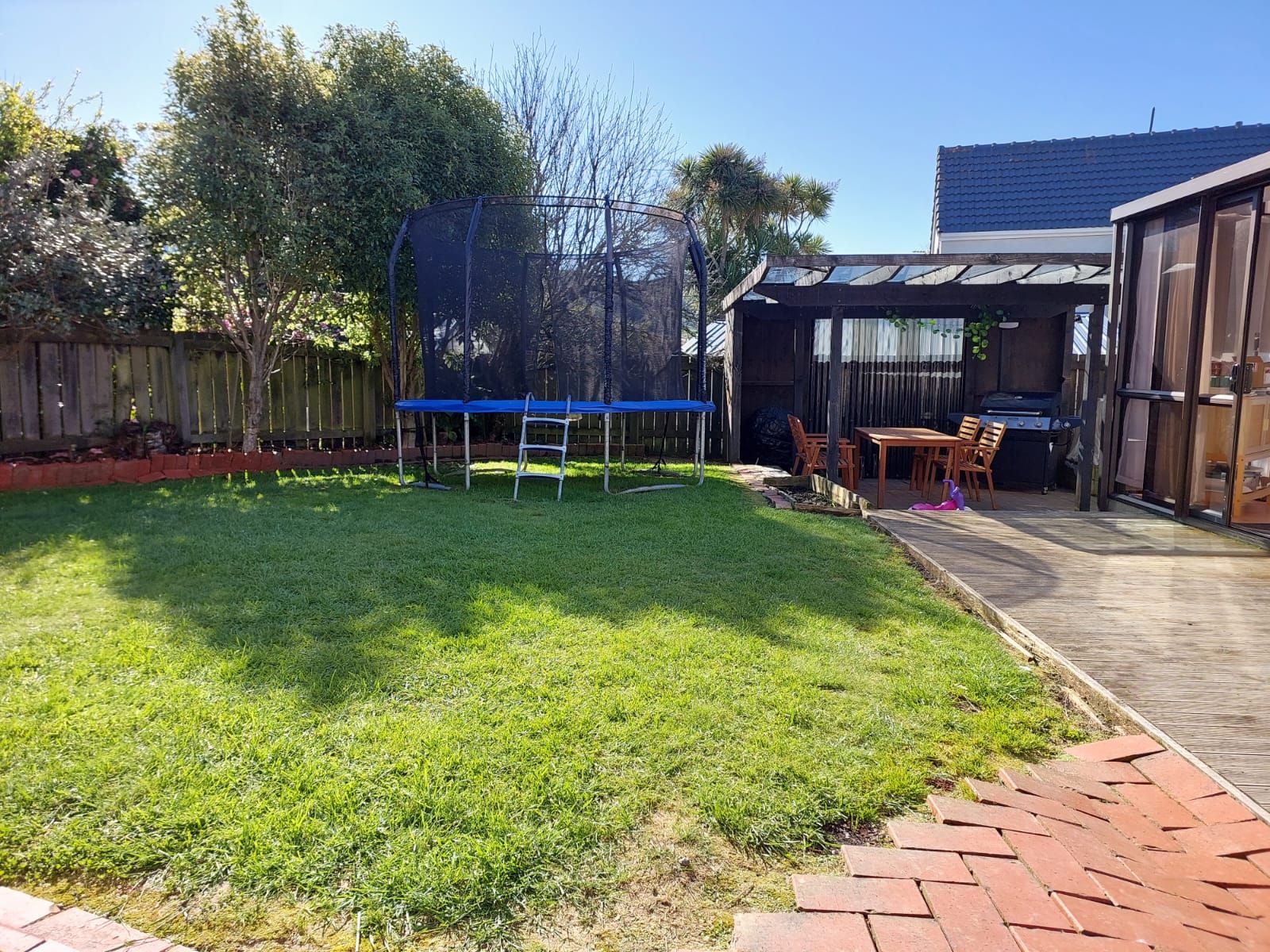 Fully fenced flat section with front and back lawns, family sized washing line and sheltered pergola with space for outdoor table and BBQ. Inbuilt sandpit and play house.