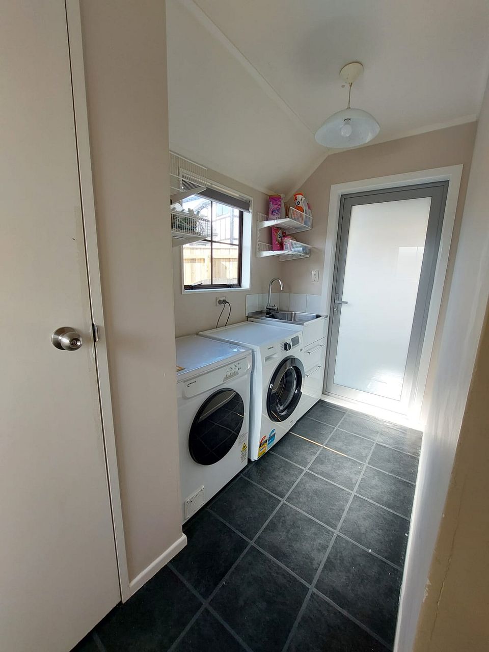Separate laundry with large cupboard, inbuilt sink and space for washer and dryer.