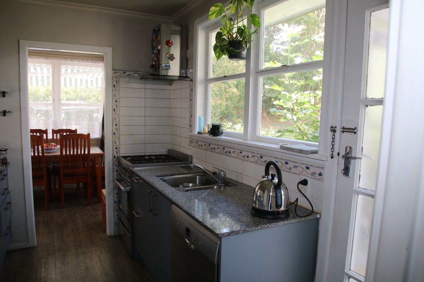 Kitchen and dining combined with a dishwasher.