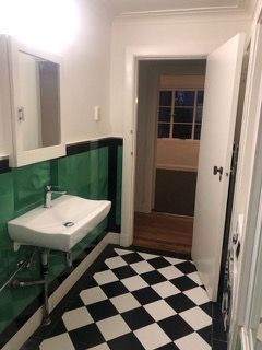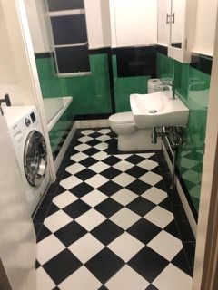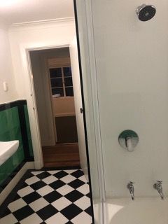 Classic Large tiled Deco bathroom: Opening Window, Bath & Shower, Heated towel rail. Laundry in Apt: Washer Drier, Storage H/W Cupboard.