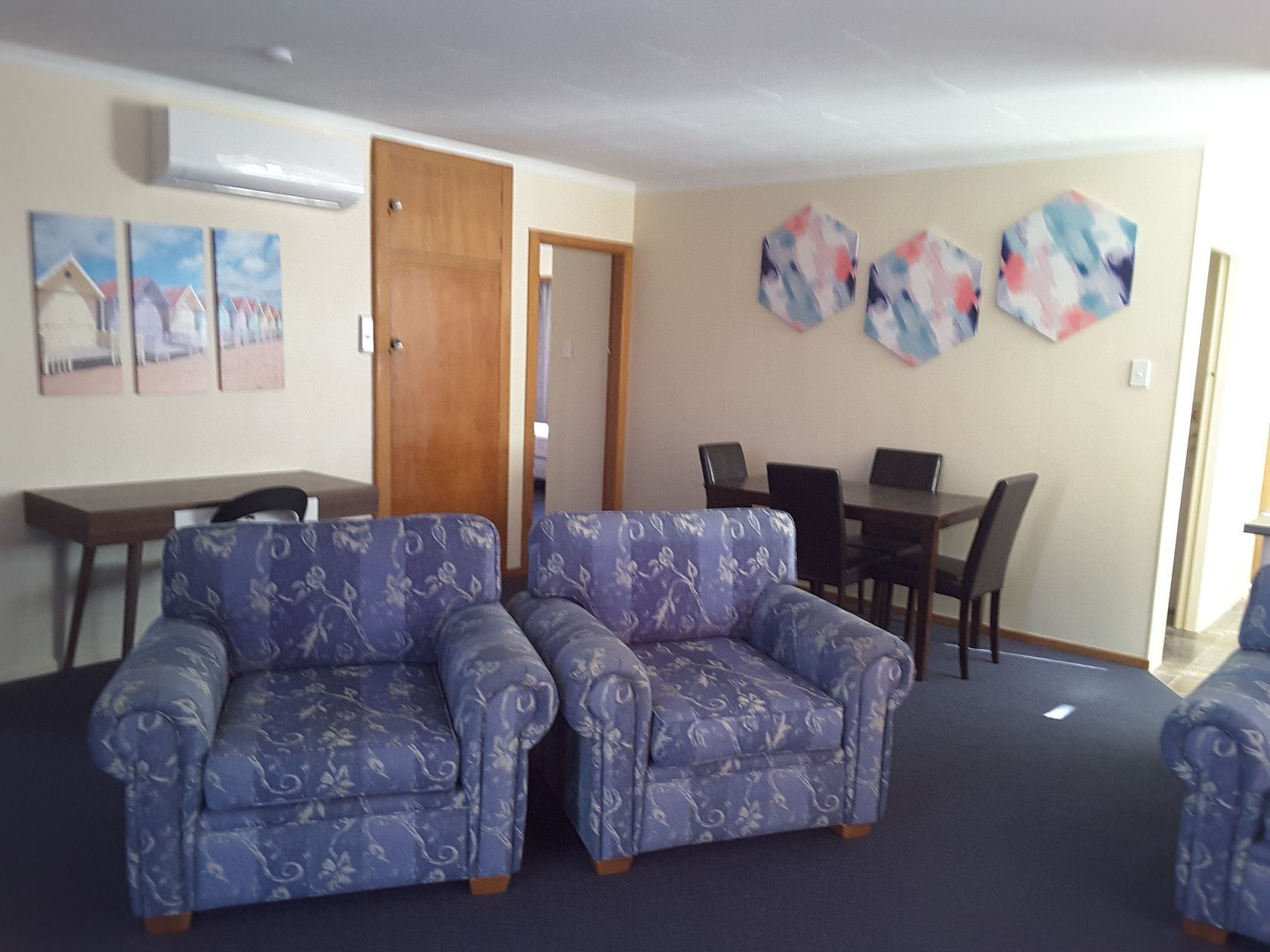 There are 2 large bedrooms. One with queen bed and the other has 2 single beds.