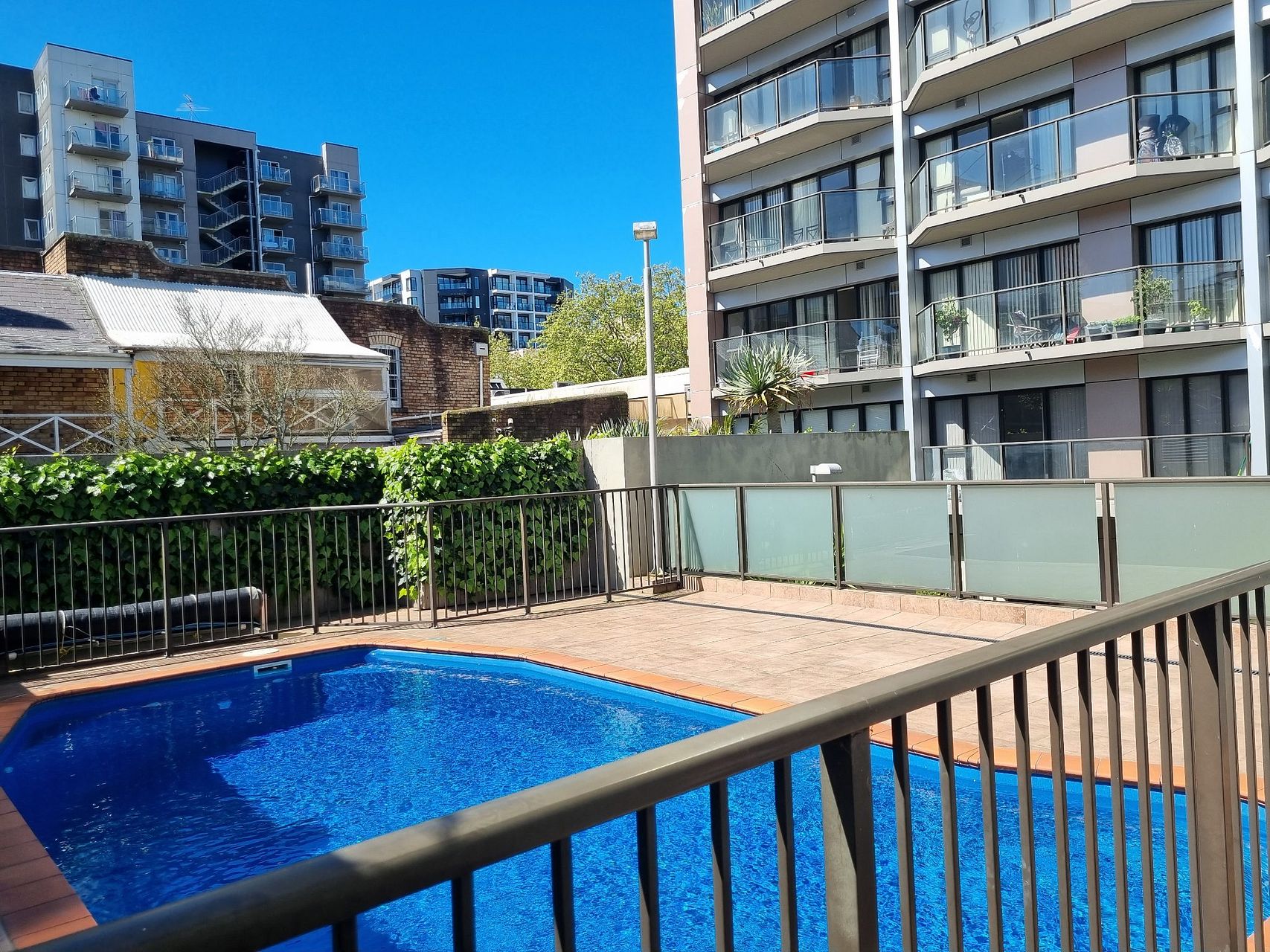 Balcony with views of courtyard and pool