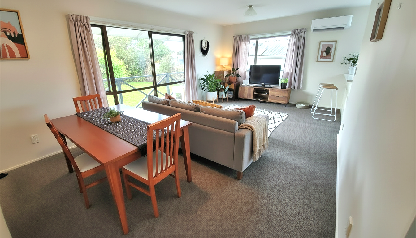- Sunny open‑plan living area opening onto a veranda and a private backyard.
