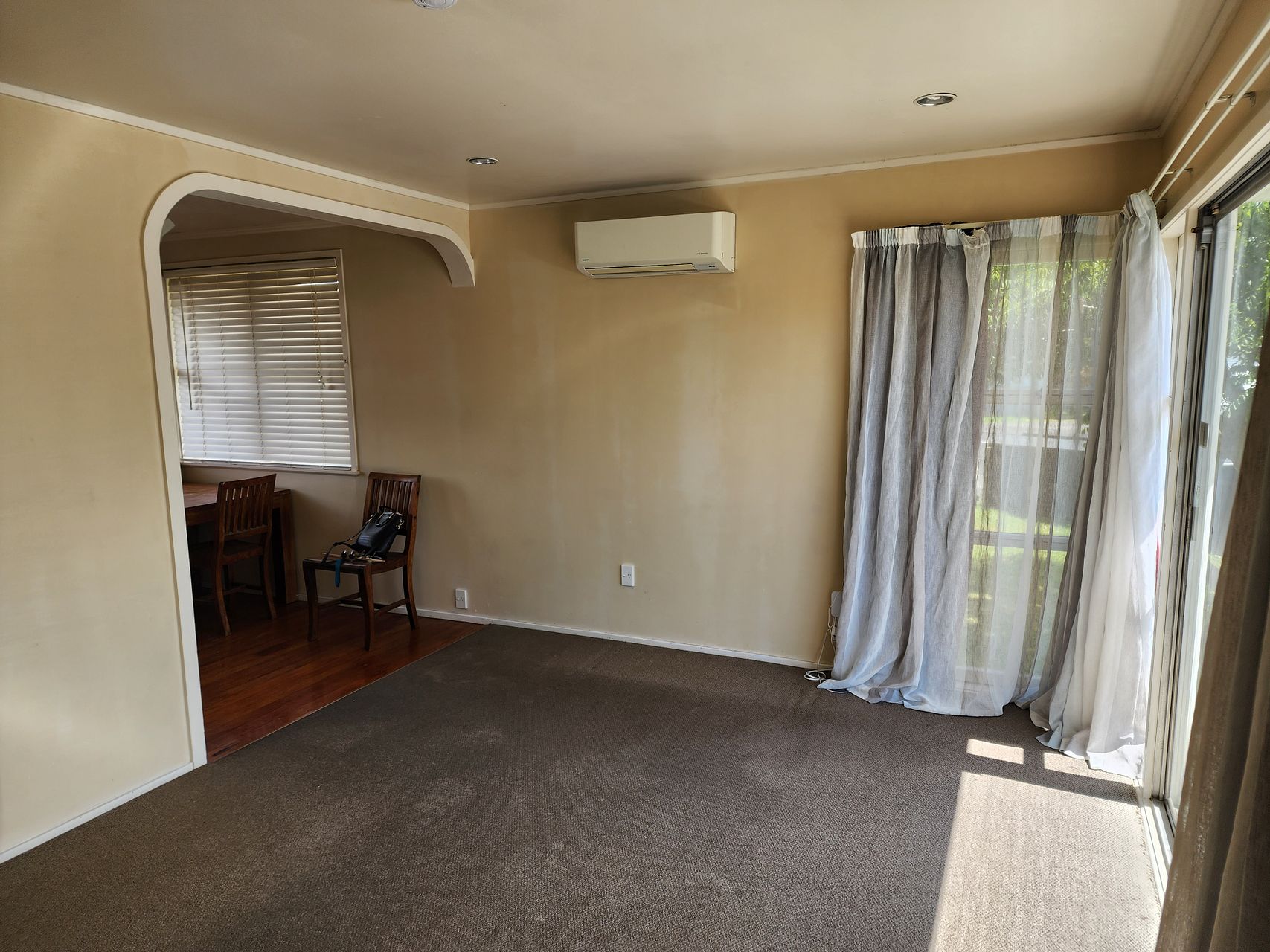 Living room with sliding door onto sunny deck