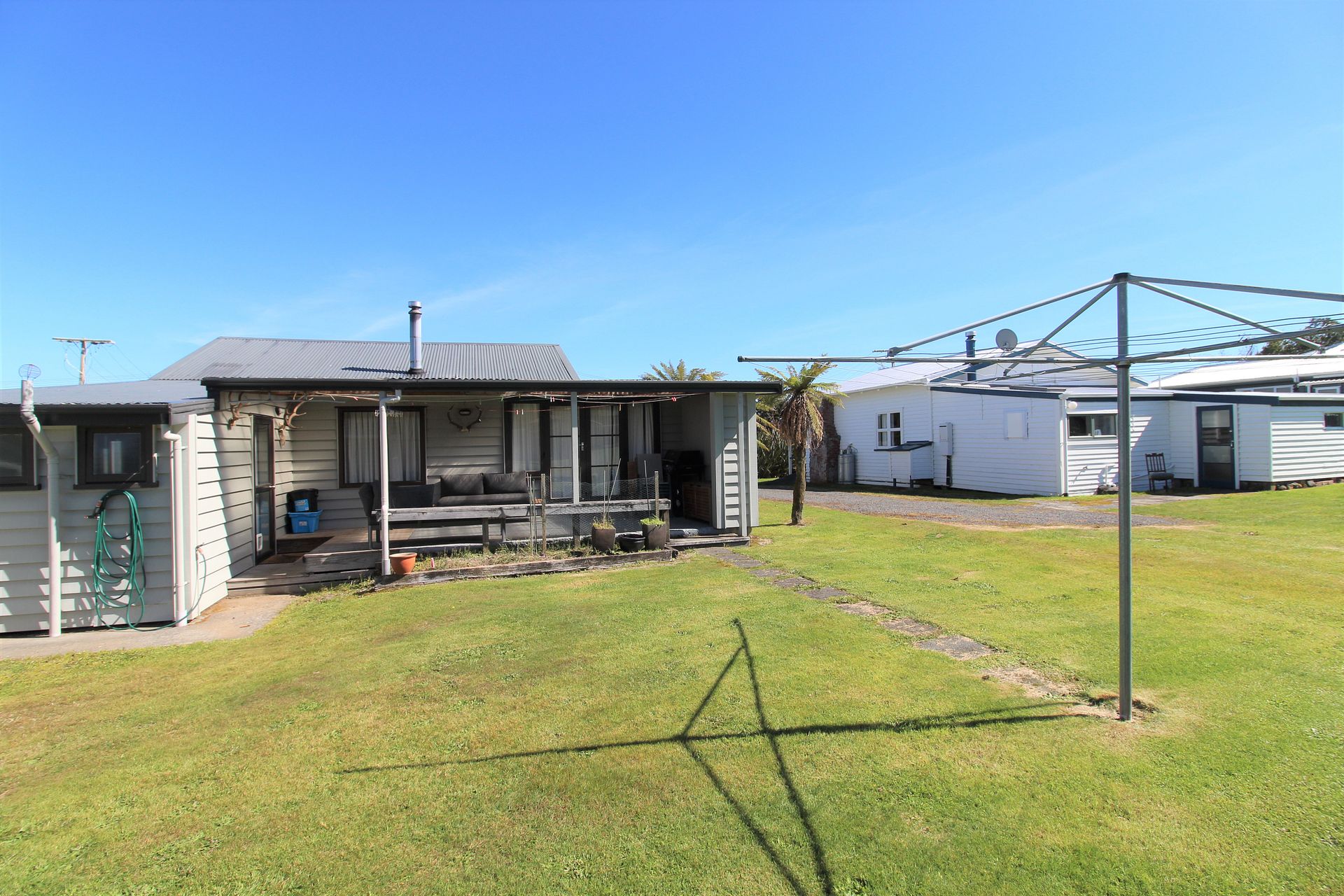The property features a grassed section at the rear, with separate wood shed storage. There is also a private BBQ patio area.