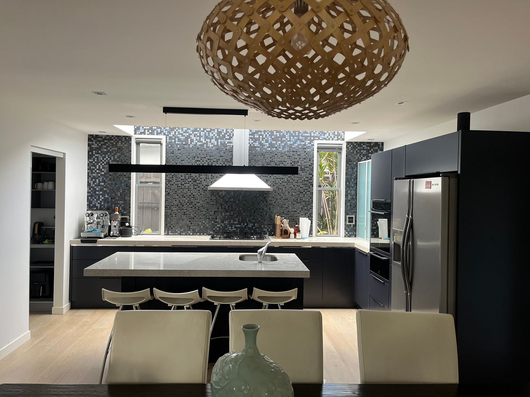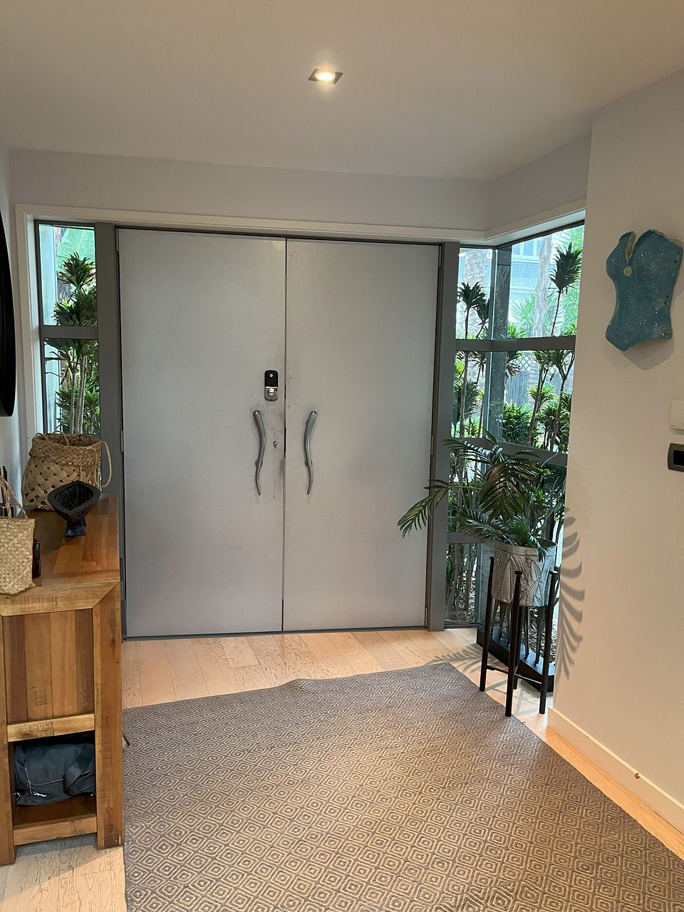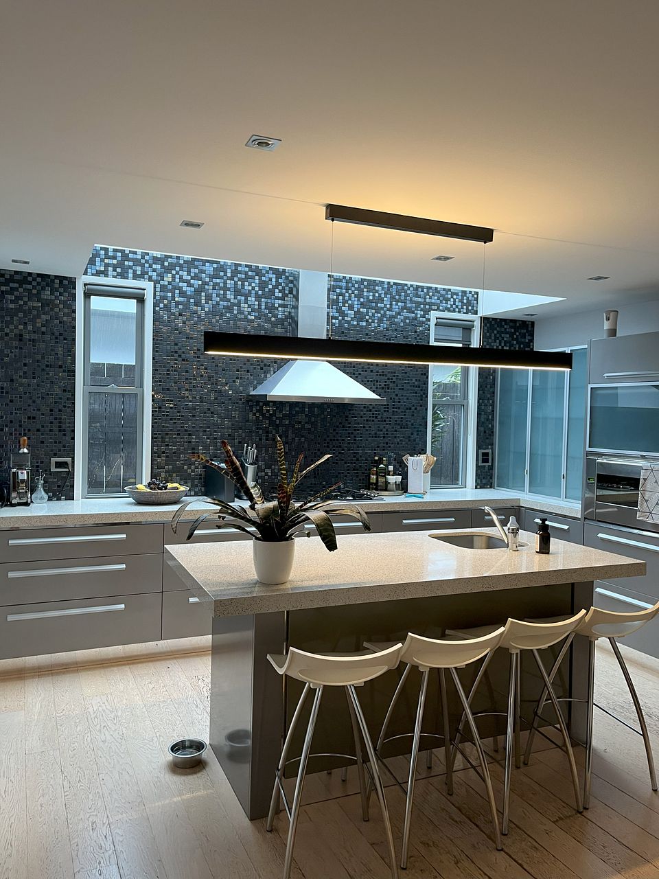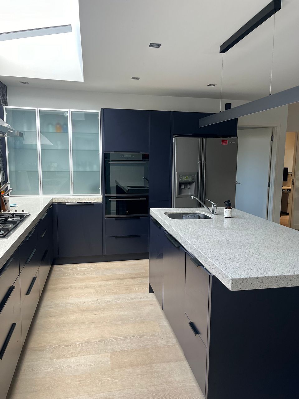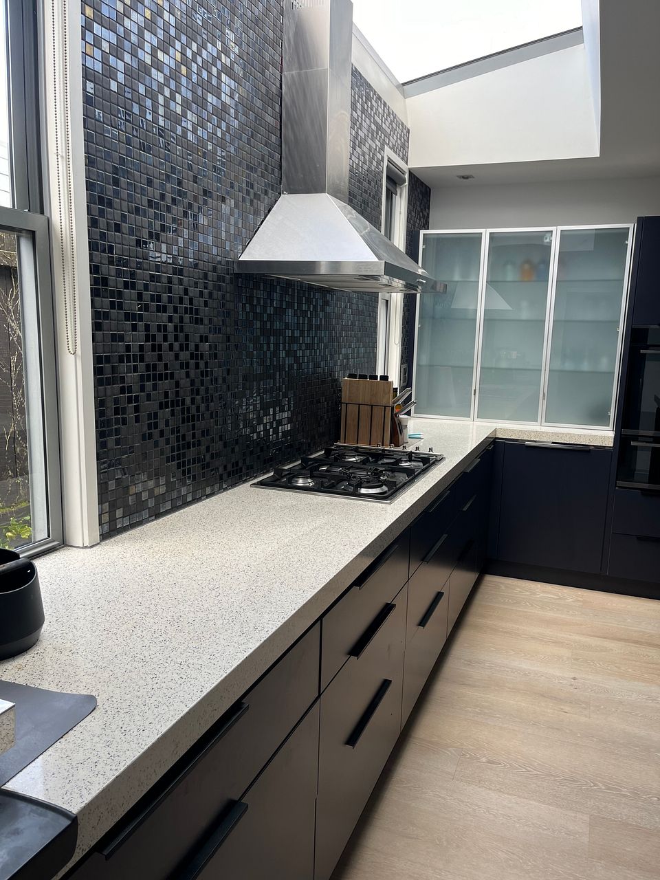 Downstairs is a large open plan living, dining and kitchen area with gas fireplace and heat pump. The kitchen is newly renovated with new double oven, integrated dishwasher, gas hob and walk-in pantry and underfloor heating. Kitchen is fully equipped. The lounge opens via stacking doors to a fenced, gated courtyard with large palm trees for extra privacy.