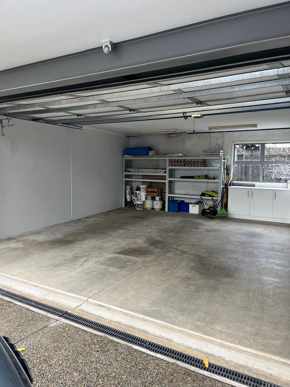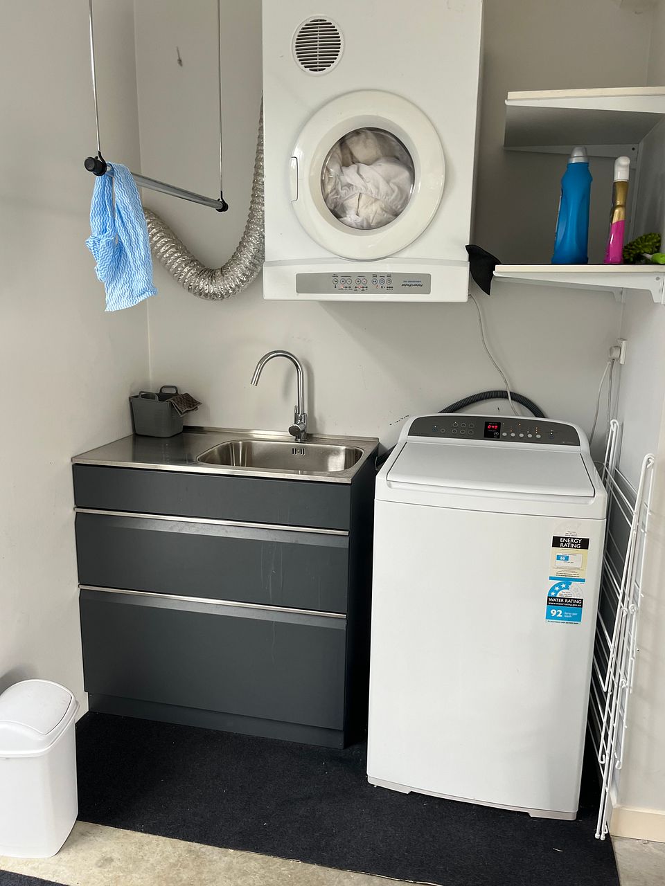 The laundry is in the double garage with a top loader washing machine and wall mounted drier.