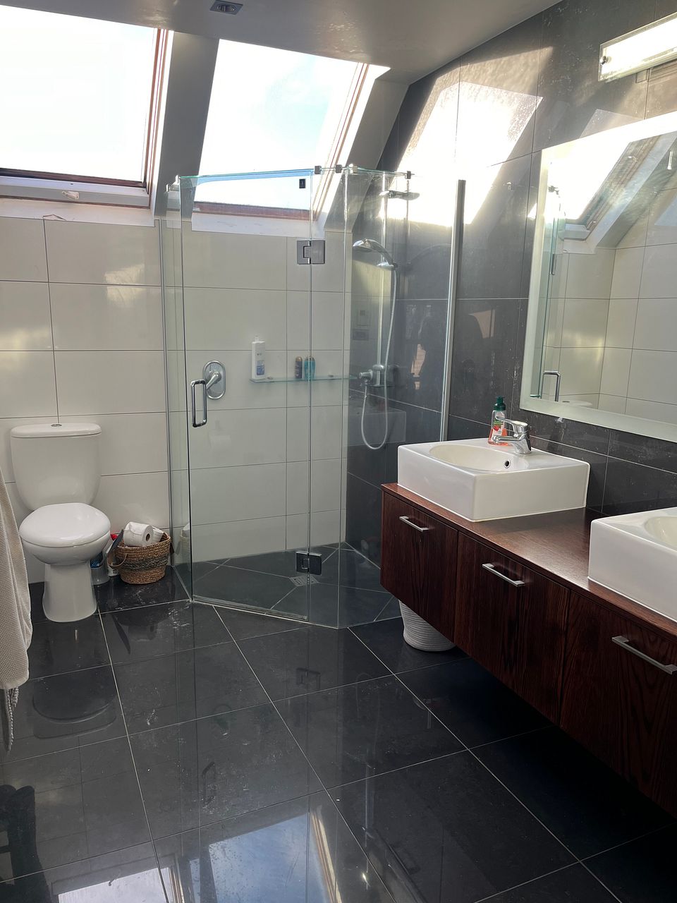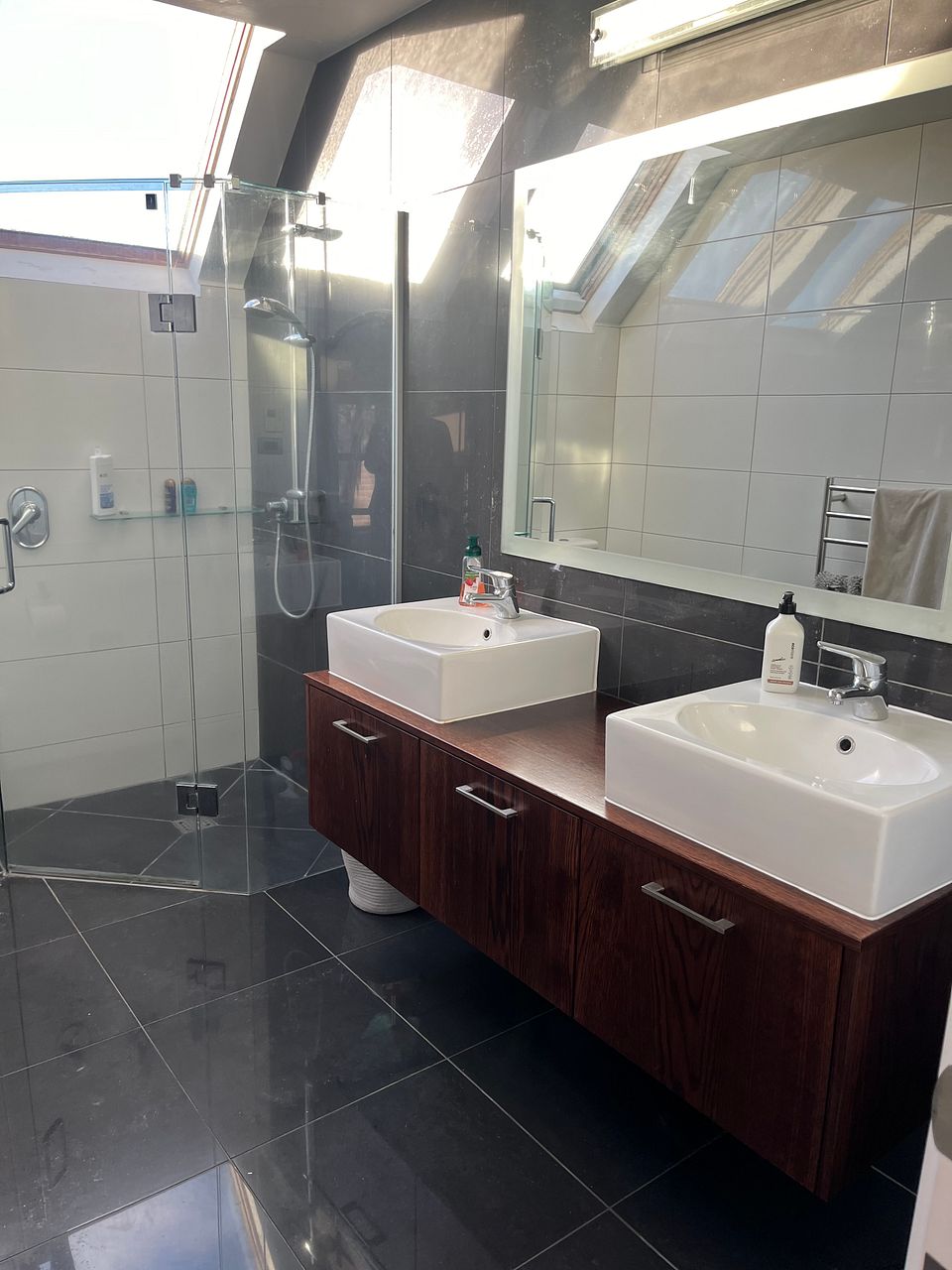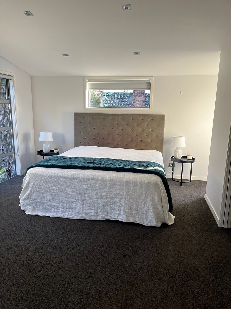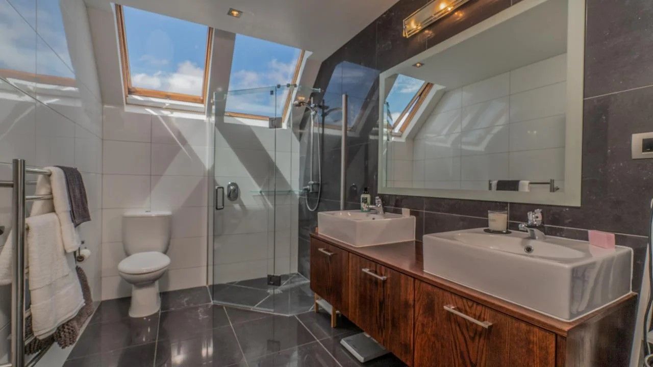 Upstairs there is a large master bedroom with super king deluxe bed, heat pump, small balcony, large walk-in wardrobe, full ensuite bathroom with under tile heating and heated towel rail. There are also a queen-sized bedroom with queen bed and wardrobe and a smaller bedroom with king single bed, double wardrobe, between the two bedrooms is a large bathroom with underfloor heating and heated towel rail.